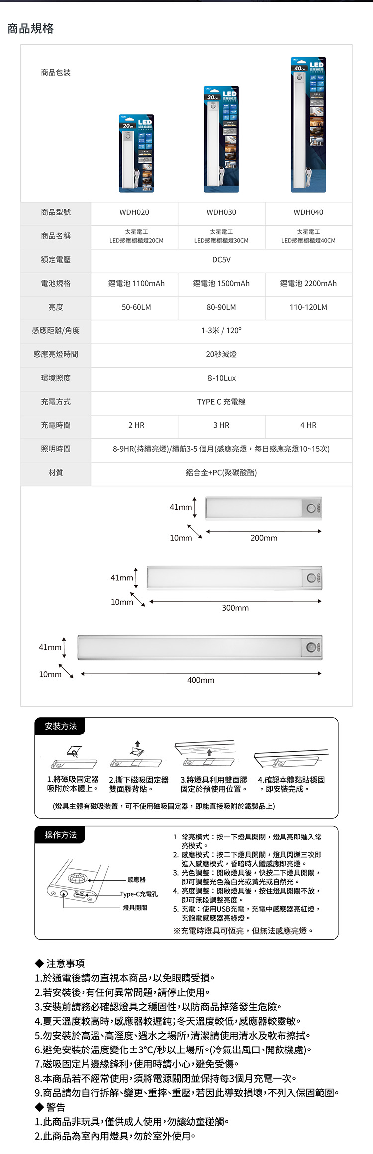 ◆商品特色1.磁吸固定,輕鬆安裝,應用範圍廣。 2.常亮/感應雙模式,多元使用最便利。 3.無段調光,點出最舒適光源亮度。 4.三種光色,搭配環境變換協調色溫。 5.超薄設計,搭配使用,不占空間。 6.USB充電,不受限制,快捷方便。 7.具充電指示功能,掌握充電狀態。◆商品規格與尺寸商品尺寸:(高)20x(寬)4.1x(深)1/公分包裝尺寸:(高)27x(寬)12x(深)1.6/公分商品重量:0.09kg包裝重量:0.15kg額定電壓:DC5V電池規格:鋰電池 1100mAh亮度:50-60LM感應距離/角度:1-3米 / 120º感應亮燈時間:20秒滅燈環境照度:8-10Lux充電方式:TYPE C 充電線充電時間:2 HR照明時間:8-9HR(持續亮燈) / 續航3-5 個月(感應亮燈,每日感應亮燈10~15次)材質:鋁合金+PC(聚碳酸酯)驗證登錄:免檢商品原產地:中國