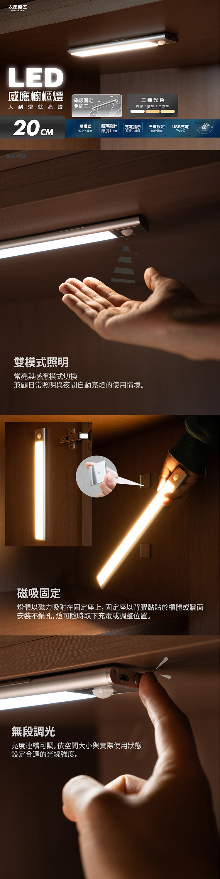 【太星電工】LED人體感應櫥櫃燈(20cm) 超薄 磁吸安裝 USB充電 三色光 (智能感應 / 櫥櫃條燈/樓梯燈)