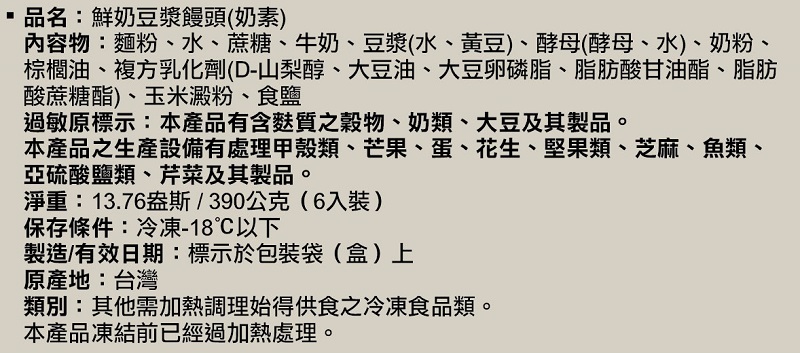 奇美鮮奶豆漿饅頭(奶素)