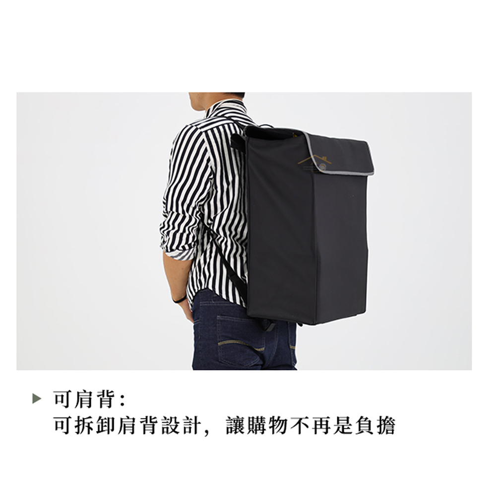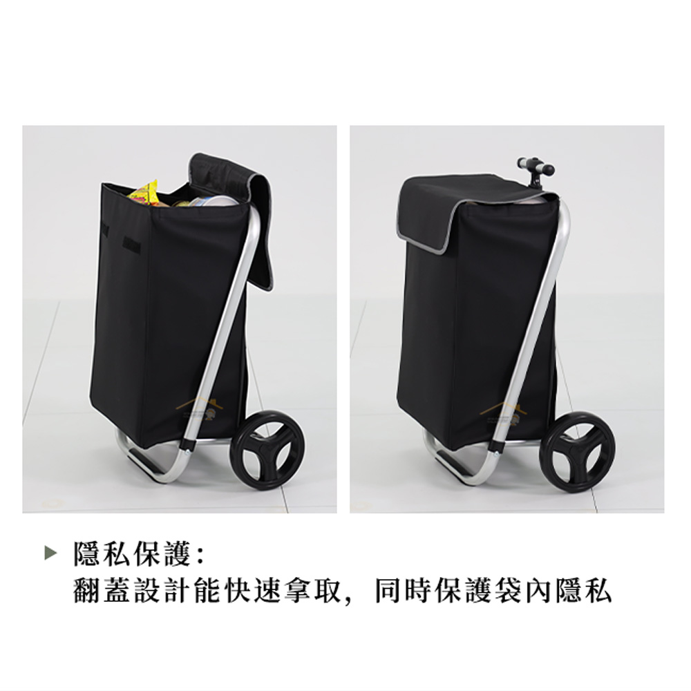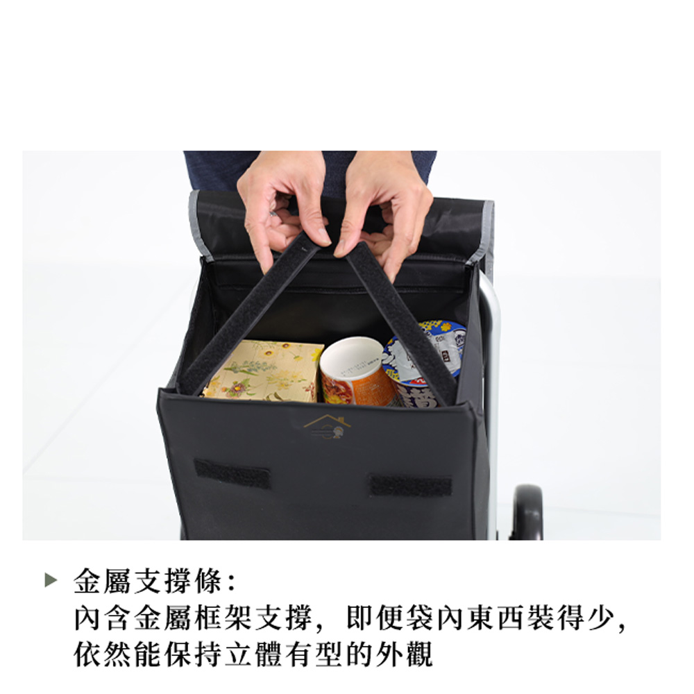 ▲單手柄帶有伸縮功能。▲堅固鋁製車架易於折疊存放。▲CKPLUS皮膜面料布袋,魔術貼固定。▲布袋翻蓋設計,邊緣反光條提升安全性能。▲開口有支撐條,布袋可變方形框架,更易放取物件。▲包內有兩個金屬支撐框架,使布袋結構更加穩定。▲17公分EVA車輪。▲無需工具即可快速安裝、拆卸。▲布袋容積:25公斤/35L。
