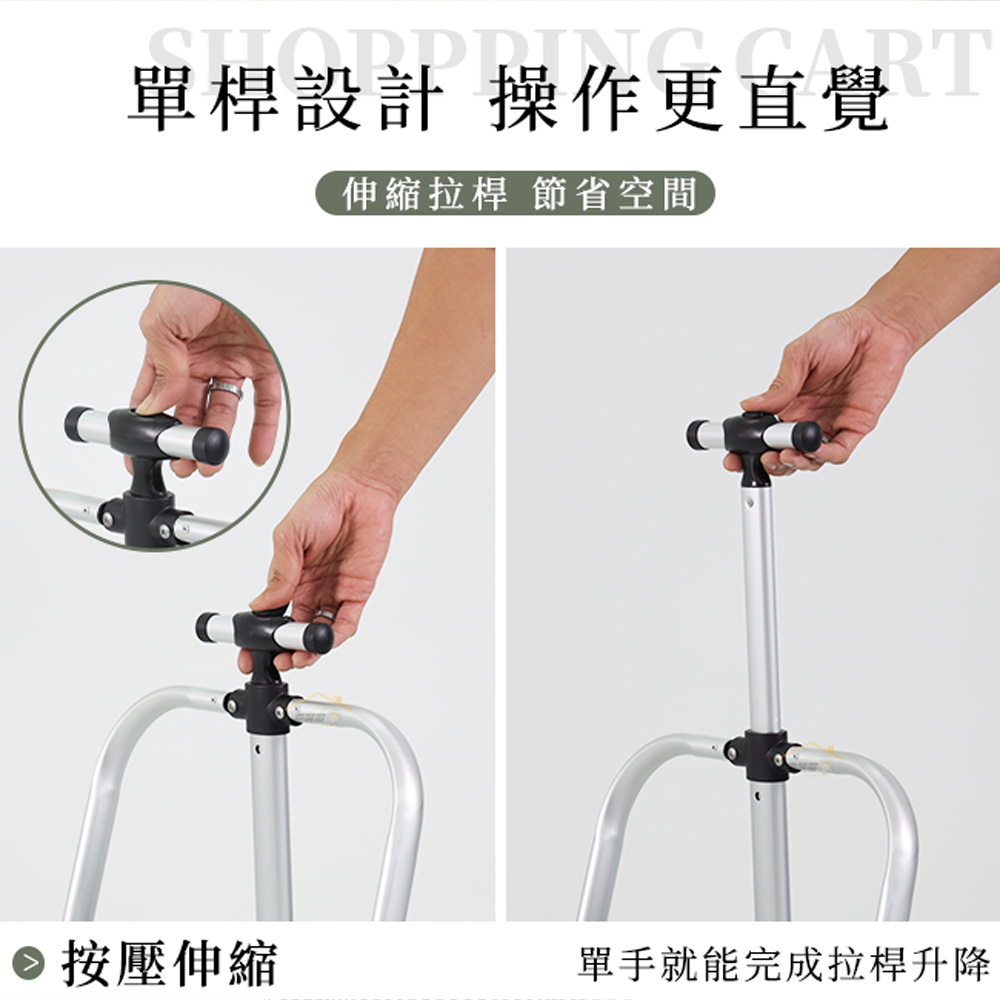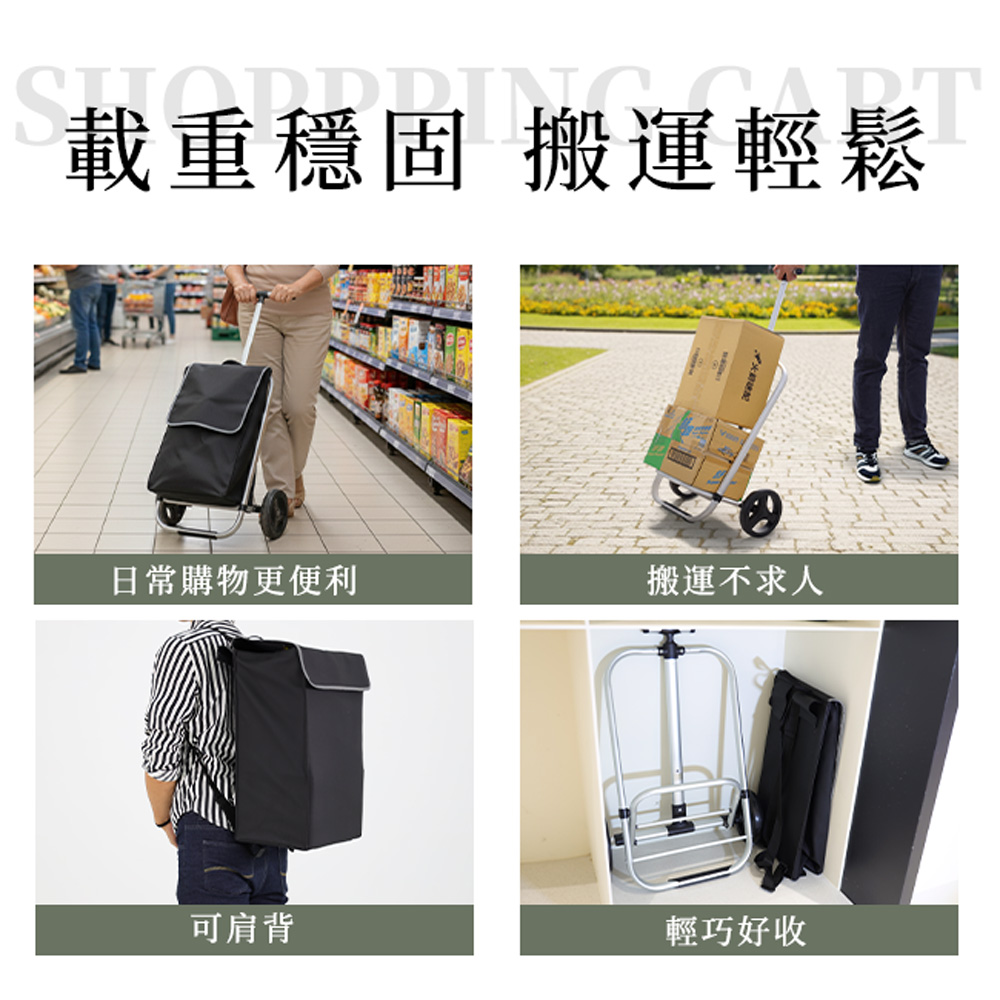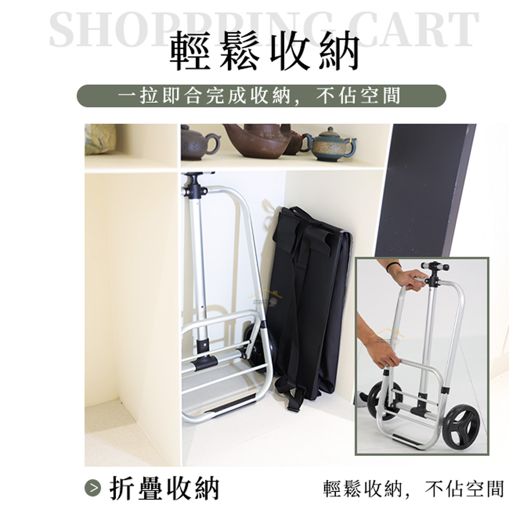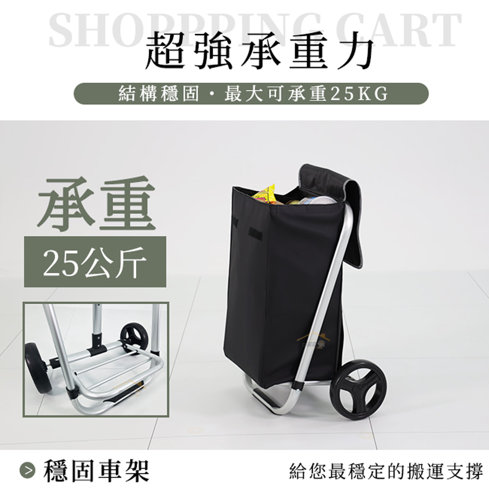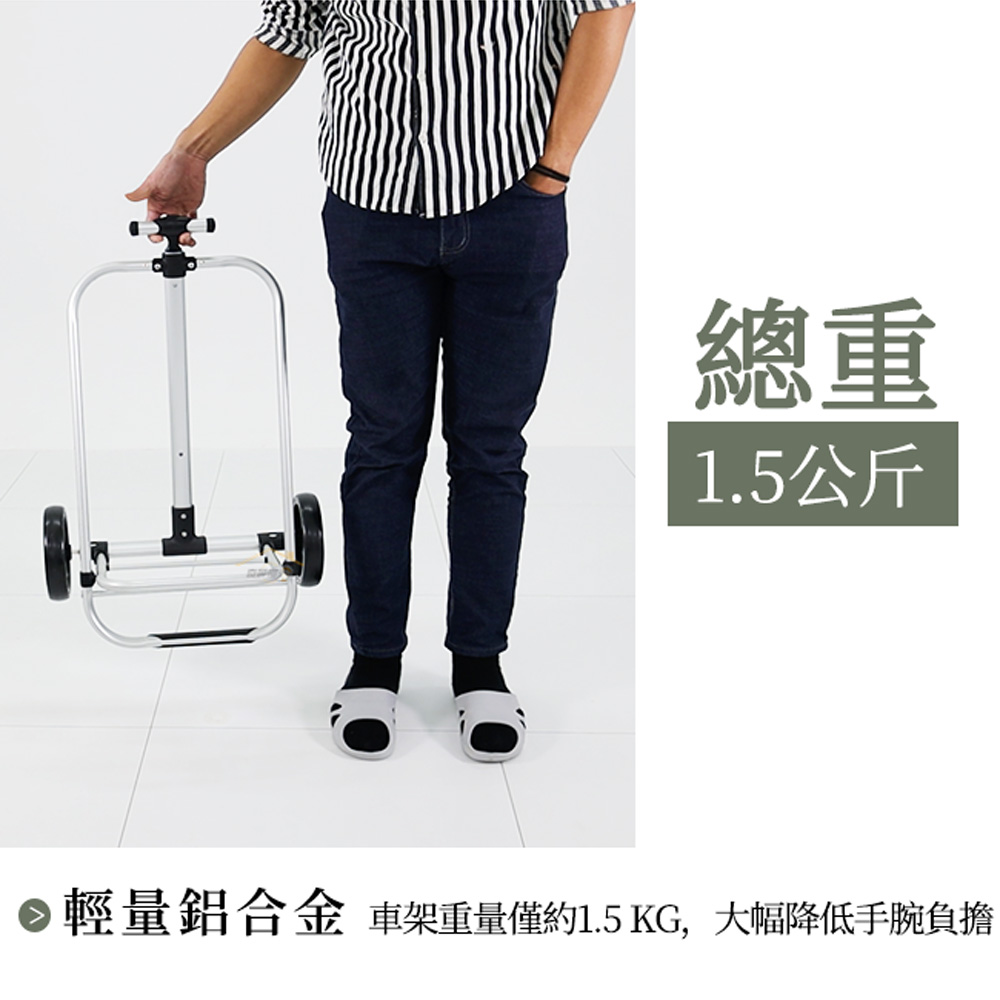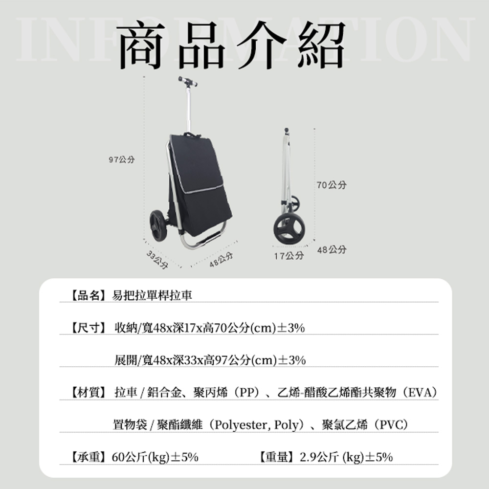 材質:拉車 / 鋁合金、聚丙烯(PP)、乙烯-醋酸乙烯酯共聚物(EVA) 置物袋 / 聚酯纖維(Polyester, Poly)聚氯乙烯(PVC)規格:長48x寬33x高97公分(cm)±3%內容物:拉車x1台、置物袋x1個承重:25公斤(kg)±5% 重量:2.4公斤(kg)±5%(置物袋0.9kg、拉車1.5kg)產地:中國