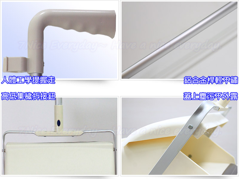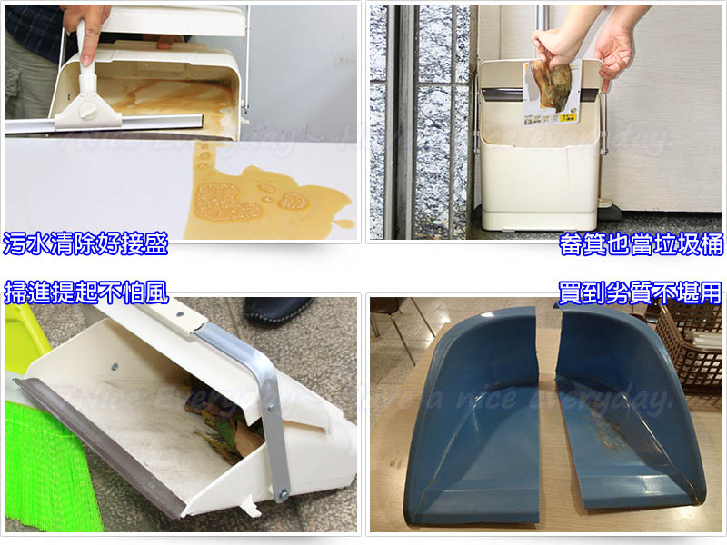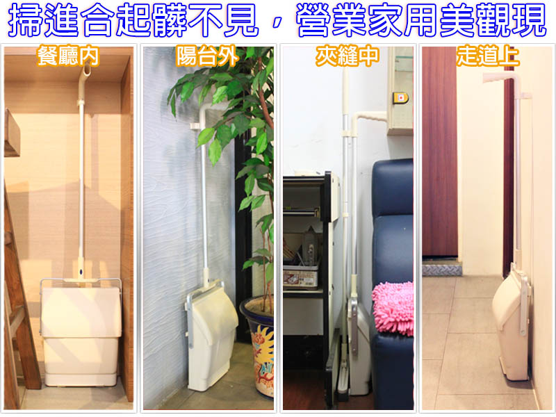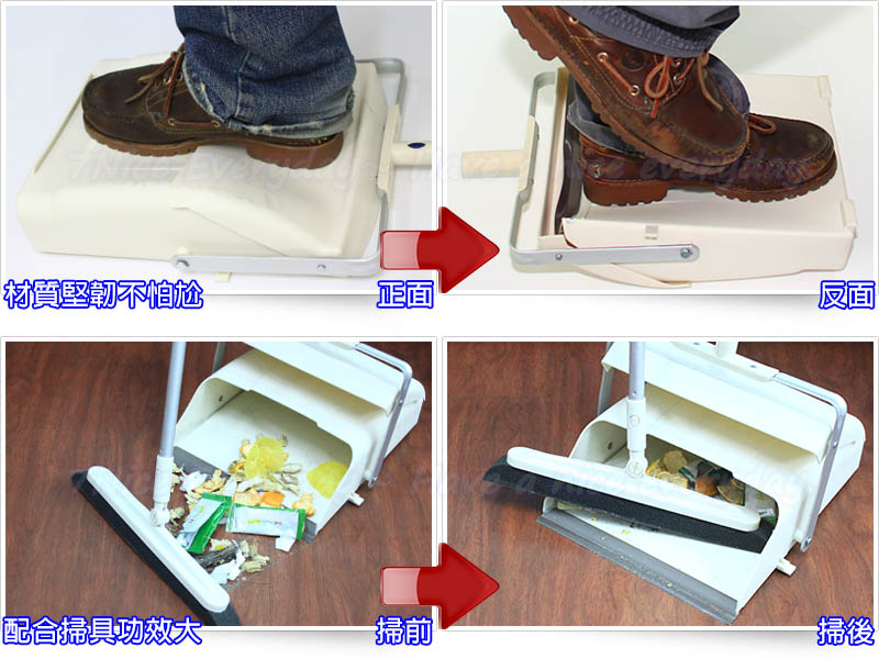 1.站立放置時,畚斗口緊閉,灰塵髒東西完全盡藏不外漏。 2.搭配奇麗掃,隨意掃隨意擺,漂亮美觀。3.放下它自動打開,拿起來自動收藏。超衛生不塵揚。4.特殊耐壓COPP塑鋼,經久耐用。