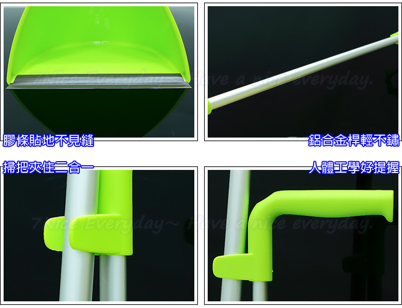 掃把:進口特殊軟性泡綿、鋁合金、ABS、聚丙烯、聚乙烯 畚斗:聚丙烯、聚氯乙烯、聚乙烯、鋁合金