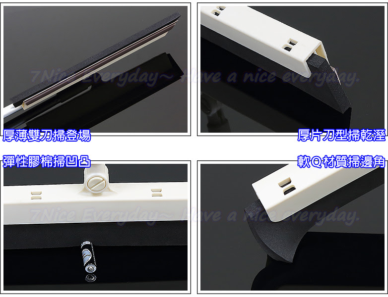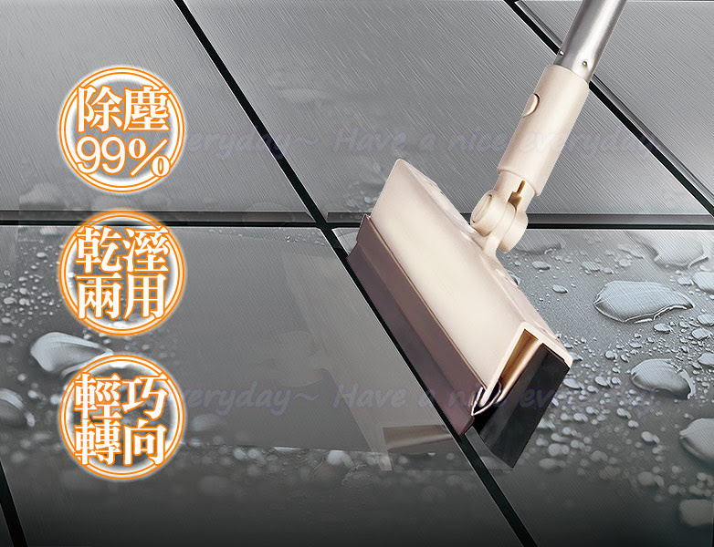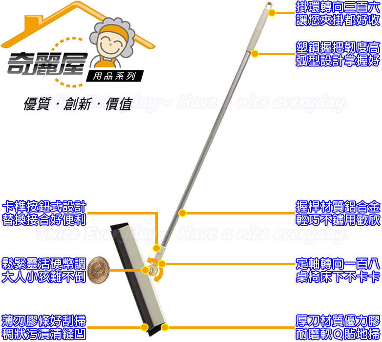 厚刀鋒具柔軟彈性,貼地力佳。 薄刀鋒主要清潔磁磚、大理石磚......等接縫溝內之不易清除之污垢。 耐用不變形,除塵、去污、刮水樣樣行。 180度可旋轉掃頭,清掃無死角,容易清洗