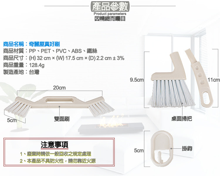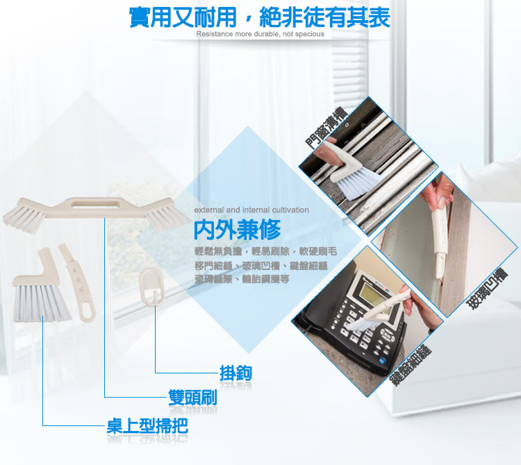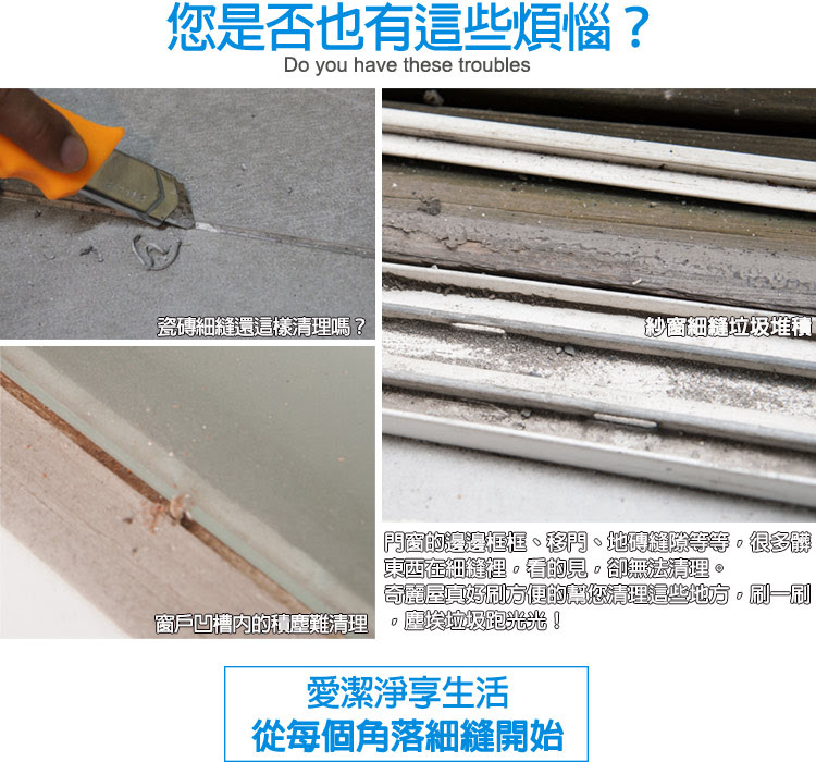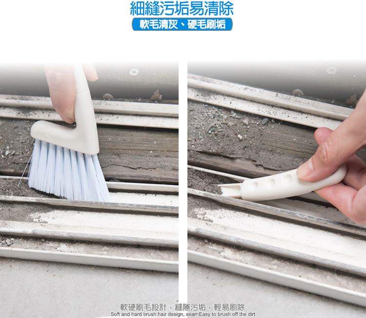 特製PVC高彈力刷毛,耐磨耐刷且去污力超強外型符合人體工學設計,好握好拿,使用起來格外輕鬆無負擔軟硬刷毛設計,隙縫污垢輕易刷除採用刮除式刷柄,污垢輕易刮除細縫灰塵輕易掃除