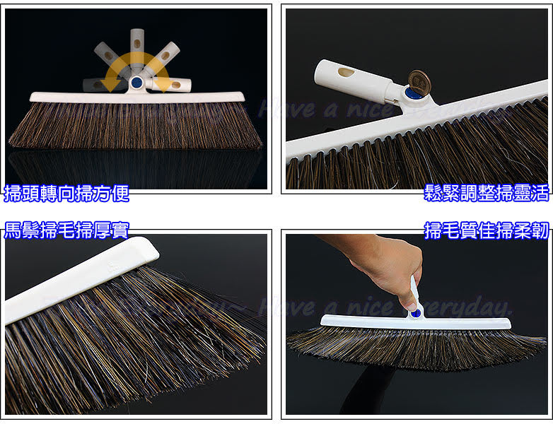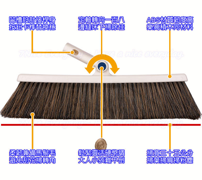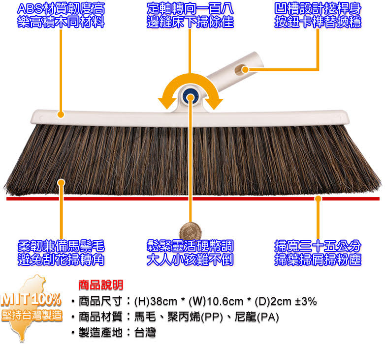 高品質馬鬃掃毛掃厚實彈性。定軸轉向無死角,輕鬆清掃不留塵。
