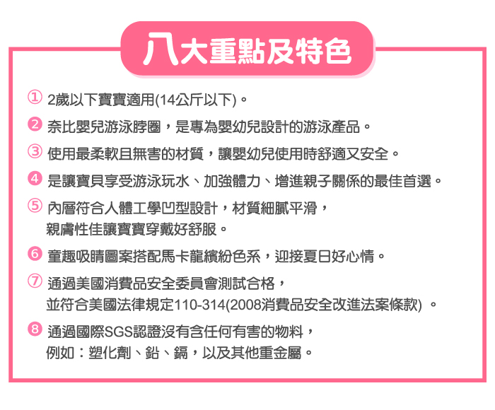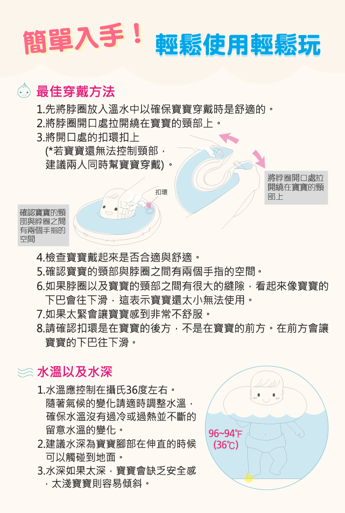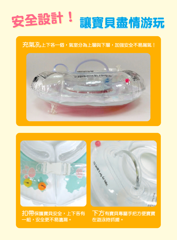 *充氣孔上下各一個,氣室分為上層與下層,加強安全 不易漏氣!*內層凹糟設計符合人體工學,材質親膚平滑,讓寶貝 穿戴舒適又安全。*扣帶保護寶貝安全,上下各有一組,安全更有保障。*下方有寶貝專屬手把,方便寶寶在游泳時抓握。*貼心附贈溫度計、充氣筒符合人體工學,安全良好的構造,幫助寶貝開始戲水的最佳泳具!親膚性材質保護寶貝嬌嫩肌膚,讓寶貝安心又輕鬆的在水裡遊玩! 通過美國PVC檢測,環保、安全、無毒性,不含有害物質。