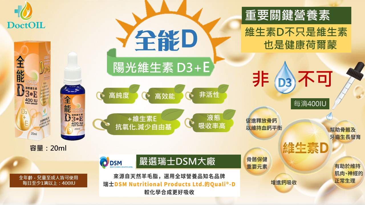 成分: 中鏈三酸甘油脂、維生素D3、維生素E(抗氧化劑)、維生素E內容量:20ml保存期限: 36個月 (未開封正常保存下)保存方式:請放置於陰涼乾燥處,避免高溫陽光直射產地: 台灣注意事項:每日一滴、每滴400IU