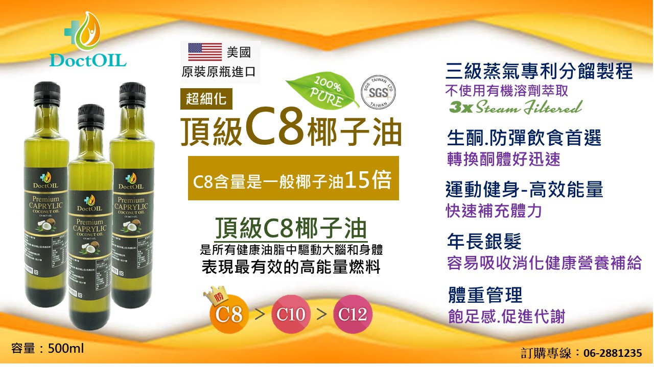 品 名: 頂級C8椰子油(原裝原瓶進口)成 分:椰子油內 容 量:500毫升/瓶保存期限:三年產 地:美國保存方式:常溫保存。食用方法:每日10-15毫升 依據個人使用狀況增減。 直接食用或加入牛奶、果汁、優格、精力湯中粥品、麵食、拌飯 或料理食物中食用,口感極佳。或製成防彈咖啡飲用。