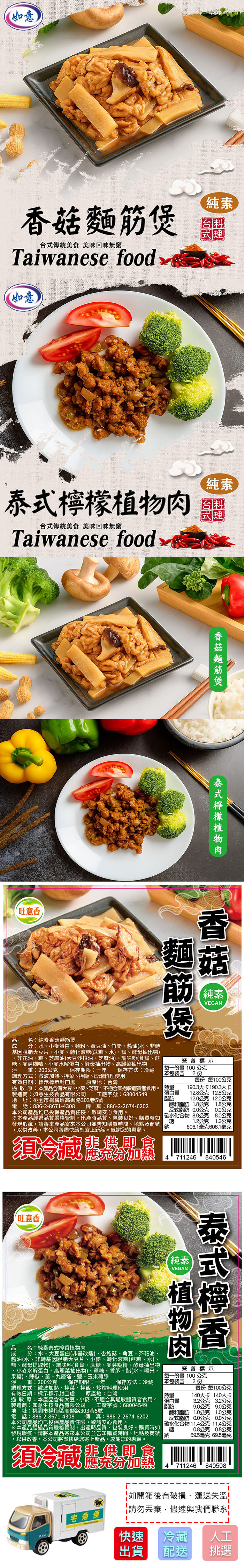 品名:香菇麵筋煲(純素) 成份:水、小麥蛋白、麵粉、黃豆油、竹筍、醬油(水、非轉基因脫脂大豆片、小麥、轉化糖液(蔗糖、水)、鹽、酵母抽出物)、芥花油、糖、芝麻油(大豆沙拉油、芝麻油)、調味粉(食鹽、蔗糖、麥芽糊精、小麥水解蛋白、酵母抽出物、高麗菜抽出物) 品名:泰式檸香植物肉(純素) 成份:水、大豆蛋白(非基改造)、杏鮑菇、角豆、芥花油、醬油(水、非基因改造脫脂大豆片、小麥、轉化液糖、(蔗糖、水)、鹽、酵母提取物)、調味料(食鹽、蔗糖、麥芽糊精、小麥水解蛋白、酵母抽出物、高麗菜抽出物)、蔗糖、香茅、醋(水、糯米、果糖)、辣椒、薑、九層塔、鹽、玉米糖膠