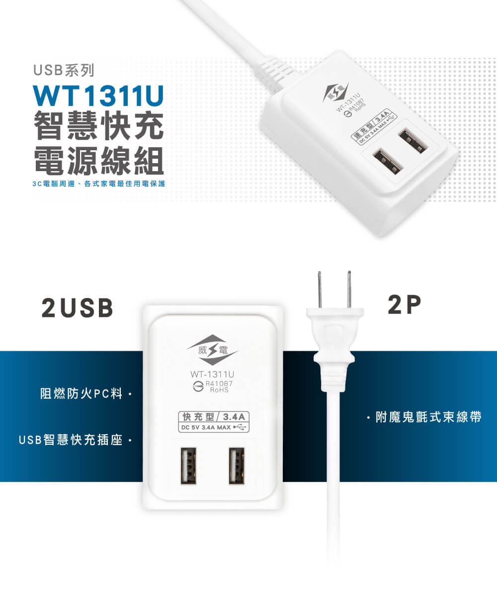 [寶旺旺]威電 2USB智慧快充3.4A充電 電源線組6尺/1.8M(延長線 防火 台灣製 可出國用 附魔鬼氈束線帶) WT-1311U
