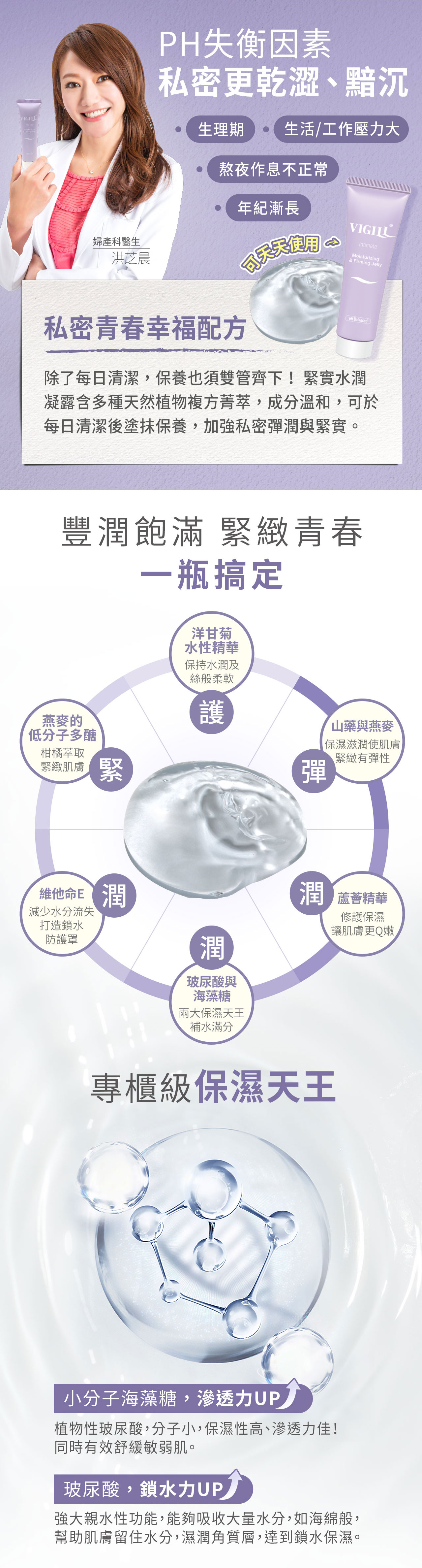 私密專用青春水潤配方!彈。潤。緊。護彈- 添加山藥萃取,植物性青春幸福成分,幫助私密肌回復彈力潤澤。潤- 蘆薈精華與小分子海藻糖,模仿女性私密滑潤感,絲緞般豐潤飽滿。緊- 燕麥的低分子多醣及柑橘萃取,能幫助緊緻肌膚,搭配凱格爾運動效果更好。護- pH3.5~4.5私密專用酸性配方,含德國洋甘菊水性精華及維他命E衍生物,修護肌膚舒緩不適感。〔不含香精、精氨酸,孕婦、哺乳媽媽亦適用〕