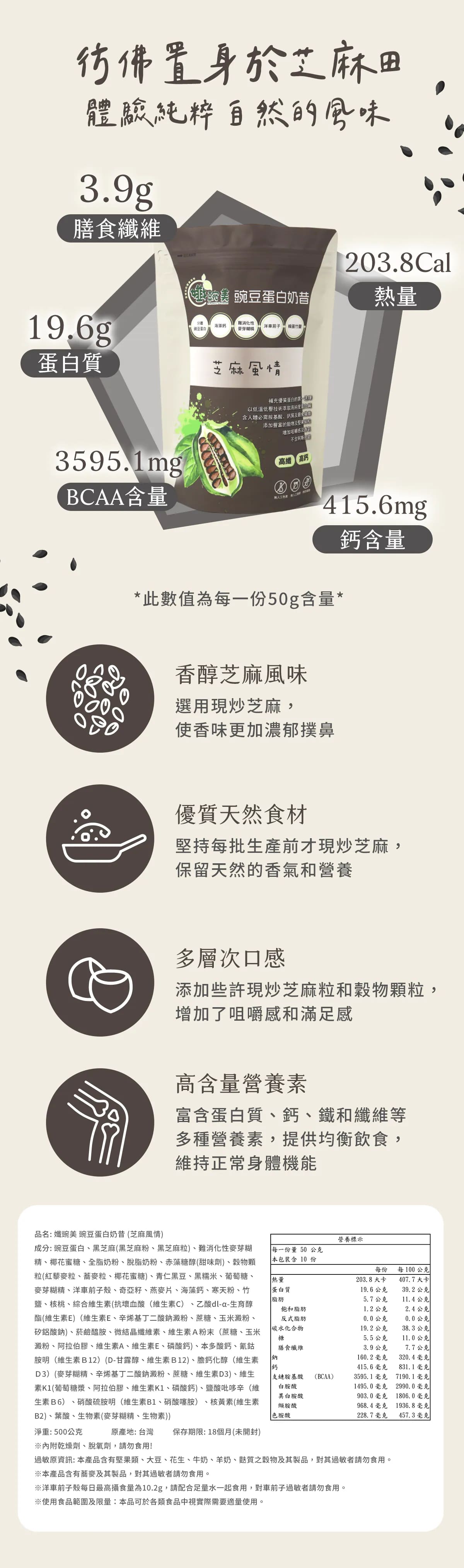 豌豆蛋白、黑芝麻(黑芝麻粉、黑芝麻粒、難消化性麥芽糊精、椰花蜜糖、全脂奶粉、脫脂奶粉、赤藻糖醇(甜味劑)、穀物顆粒(紅藜麥粒、蕎麥粒、椰花蜜糖)、青仁黑豆、黑糯米、葡萄糖、麥芽糊精、洋車前子殼、奇亞籽、燕麥片、海藻鈣、寒天粉、竹鹽、核桃、綜合維生素:抗壞血酸(維生素C)、乙酸dl-o-生育醇酯(維生素E)(維生素E、辛烯基丁二酸鈉澱粉、蔗糖、玉米澱粉、矽鋁酸鈉)、菸鹼醯胺、微結晶纖維素、維生素A粉末(蔗糖、玉米澱粉、阿拉伯膠、維生素A、維生素E、磷酸鈣)、本多酸鈣、氰鈷胺明(維生素B12)(D-甘露醇、維生素B12)、膽鈣化醇(維生素D3)(麥芽糊精、辛烯基丁二酸鈉澱粉、蔗糖、維生素D3)、維生素K1(葡萄糖漿、阿拉伯膠、維生素K1、磷酸鈣)、鹽酸吡哆辛(維生素B6)、硝酸硫胺明(維生素B1、硝酸噻胺)、核黃素(維生素B2)、葉酸、生物素(麥芽糊精、生物素)
