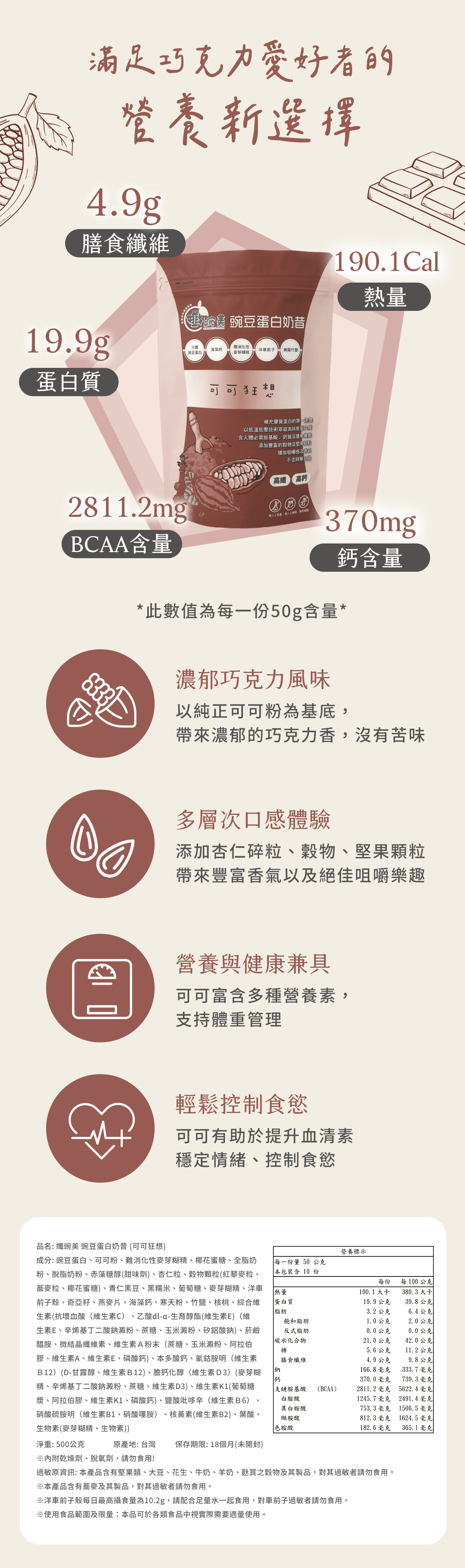 每一份量32公克,本包裝含1份,每份熱量121.7大卡,蛋白質12.8公克,脂肪2.1公克,飽和脂肪0.6公克、反式脂肪0.0公克,碳水化合物13.4公克,糖3.6公克,膳食纖維3.1公克,鈉106.8毫克