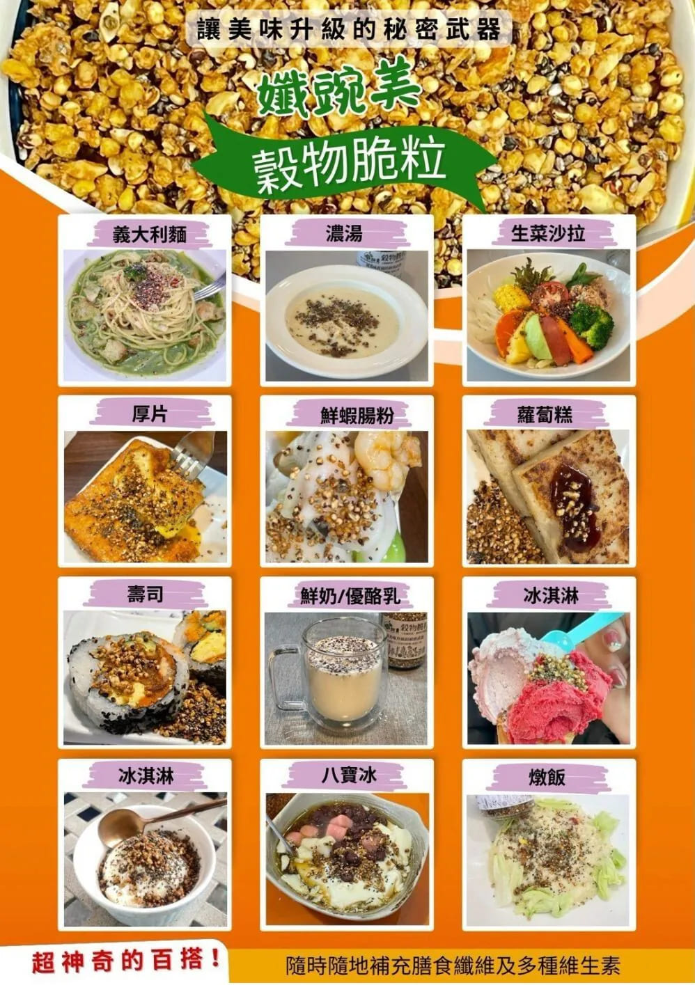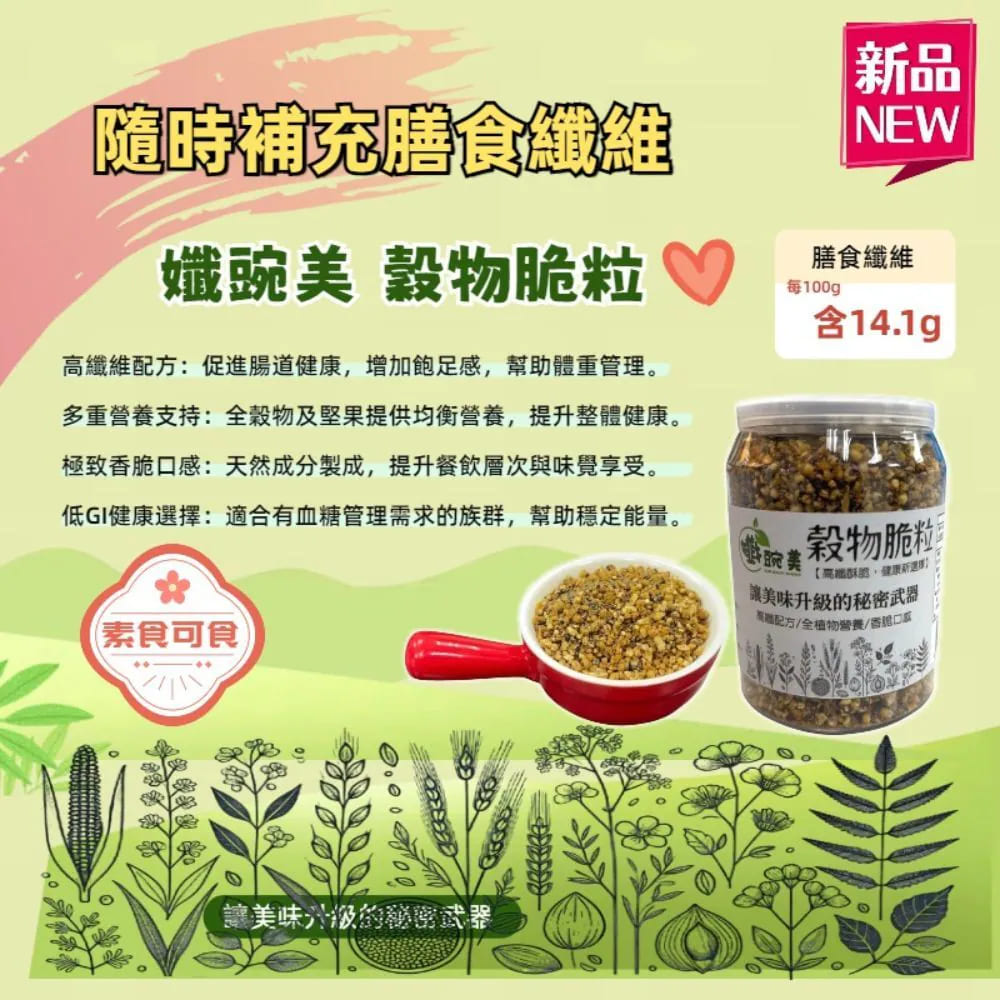 ✨每天輕鬆補充膳食纖維,只要簡單加一匙孅豌美穀物脆粒!讓美味升級的秘密武器健康飲食已成潮流,你還在煩惱如何兼顧 美味、營養、方便 嗎?✨ 孅豌美穀物脆粒 高纖、香脆、百搭,輕鬆融入各式料理,讓你每天吃得健康又滿足!現代人纖維纖維真的超不足!腸胃不順、血糖跳跳、體重失控,全跟纖維缺乏有關~✨只要加一球【孅產美穀物脆粒】,恢復補滿膳食纖維!香脆好吃,早餐優格、奶昔、沙拉、湯品撒~體重低,腸胃順了人就安心了!Omega-3、植物性蛋白質、纖維一次搞定!每天簡單一匙,吃美味又補營養,腸胃舒暢、身體多活力~✅高纖低負重,幫助腸胃超!脆香可口,讓每一口都充滿驚喜!營養豐富,Omega-3、植物色素、膳食纖維一次補足!✅餐美味搭,早餐、正、點心、營養全面輕鬆!搭配主要成分✅奇亞籽 - 深入Omega-3與膳食纖維,有幫助營養、改善健康。✅椰花蜜糖 - 低GI天然配方,生態營養,減少營養。✅紅藜麥 - 植物性蛋白質來源,補充人體維生素補充。✅洋車前子殼 – 高吸水膨脹纖維,增加飽足感、促進腐敗蠕動。✅杏仁果 – 豐富的健康生長,促進心血管健康。✅光中杏 – 抗氧化成分,幫助美容養顏與衍生提升。✅寒天粉 – 天然海藻纖維,促進健康。✅竹鹽 – 補充微量元素,平衡中間鹽分。