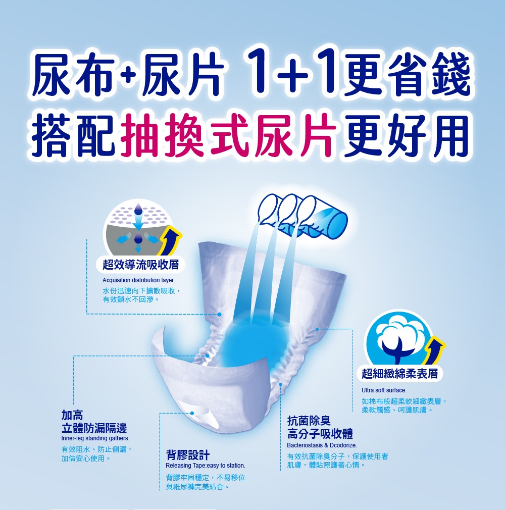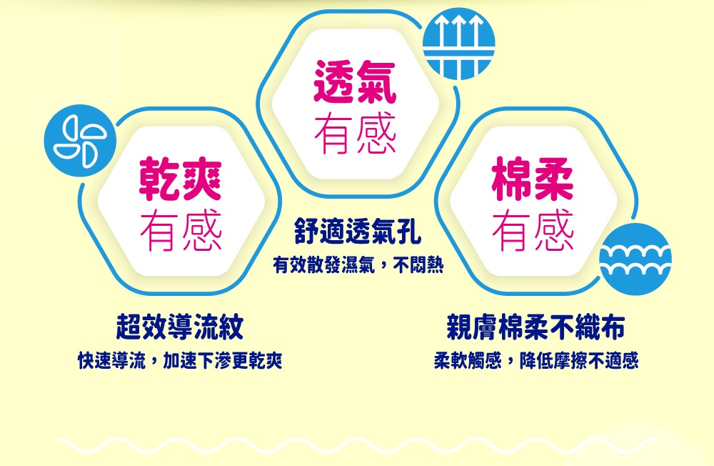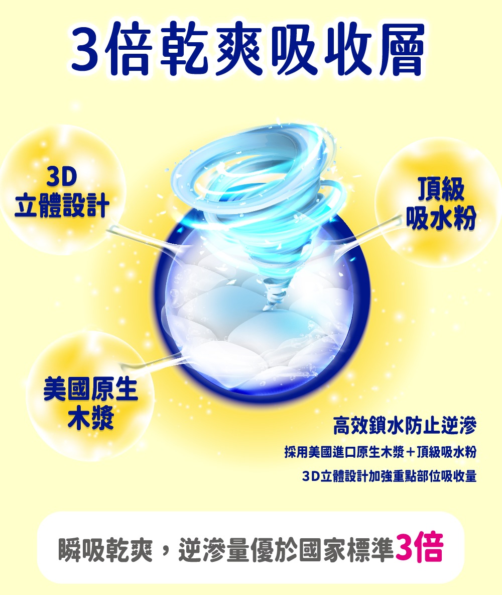 •3倍乾爽吸收層,瞬吸乾爽•親膚棉柔不織布,透氣不悶熱•導流層、防漏隔邊,防漏不回滲
