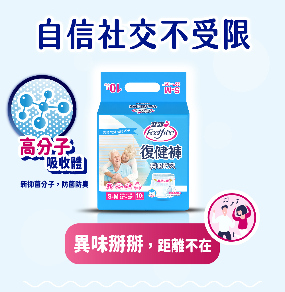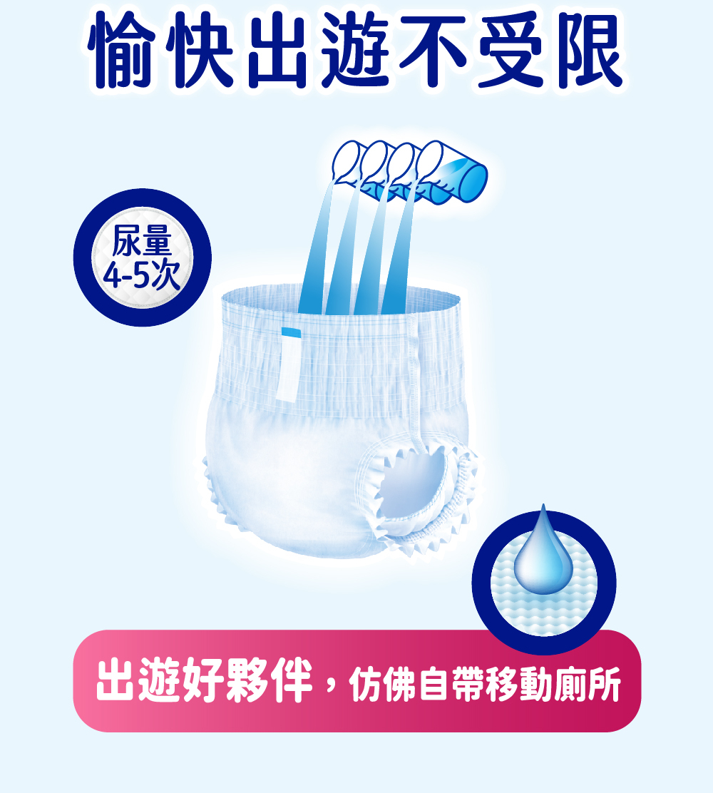 •適用於在他人協助下或可自行走動之長者•吸收力約可達4-5次尿量,長時間外出好方便•三重防漏全面環繞,輕鬆穿脫•表層瞬間吸收,極乾爽,降低悶熱感