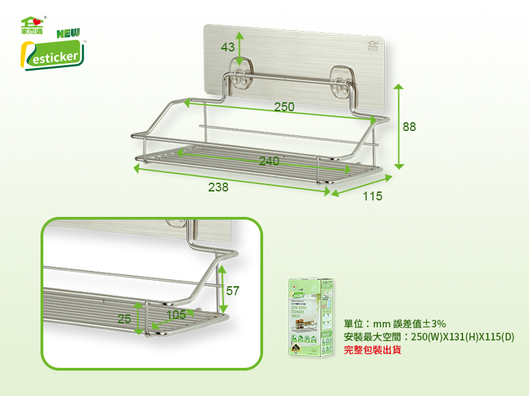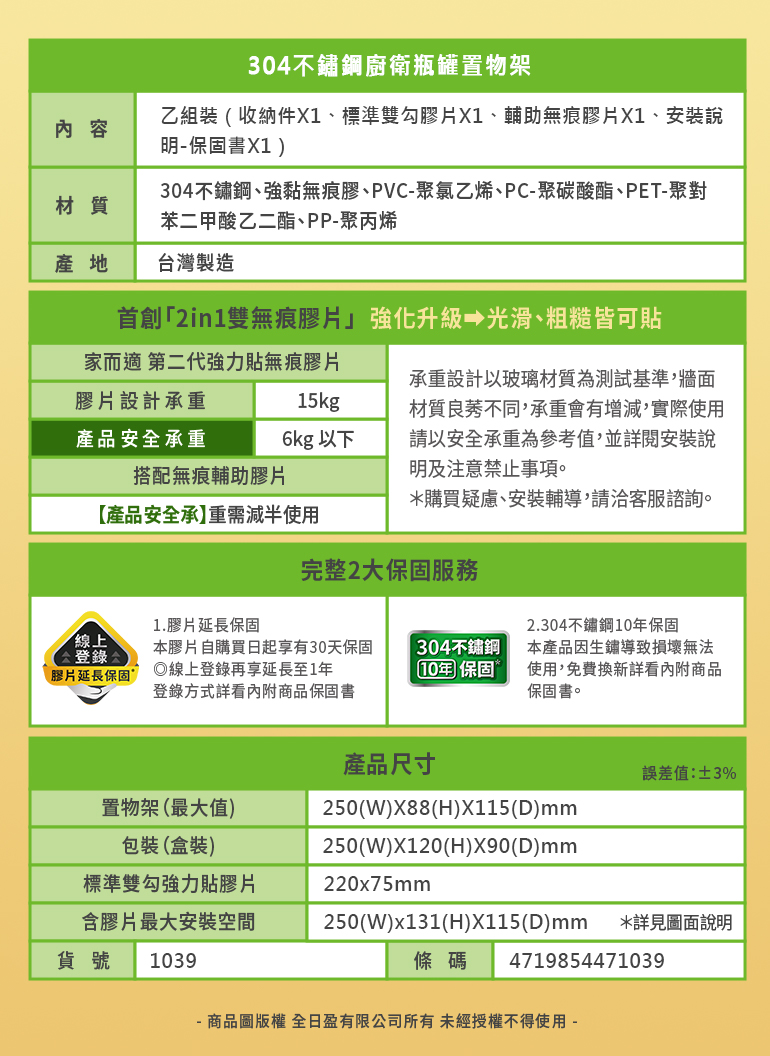 一入裝含:304不鏽鋼置物架X1、迷你雙鉤強力貼膠片X1、無痕輔助膠片X1、保固說明卡X1
