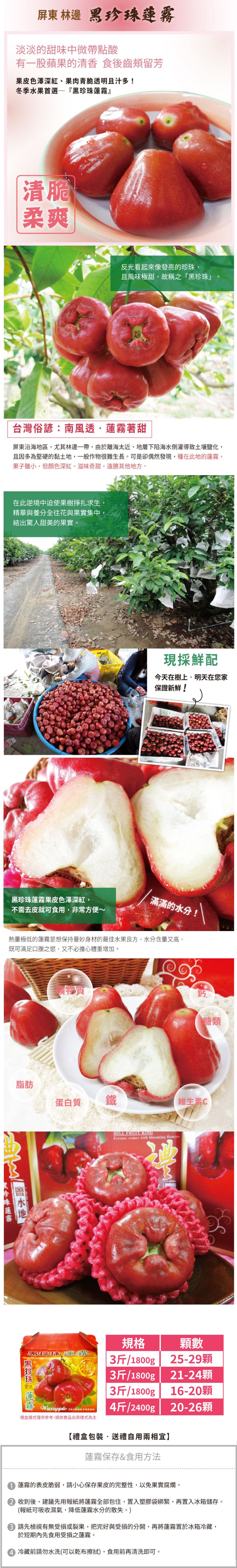 嚴選來自屏東林邊的黑珍珠蓮霧,果皮深紅近黑、光澤亮麗,果肉細緻爽脆,入口清甜多汁、幾乎無澀味。得天獨厚的日照與海風環境,孕育出甜度高、口感穩定的頂級蓮霧,是產地直送的新鮮美味,無論自用或送禮都體面大方。