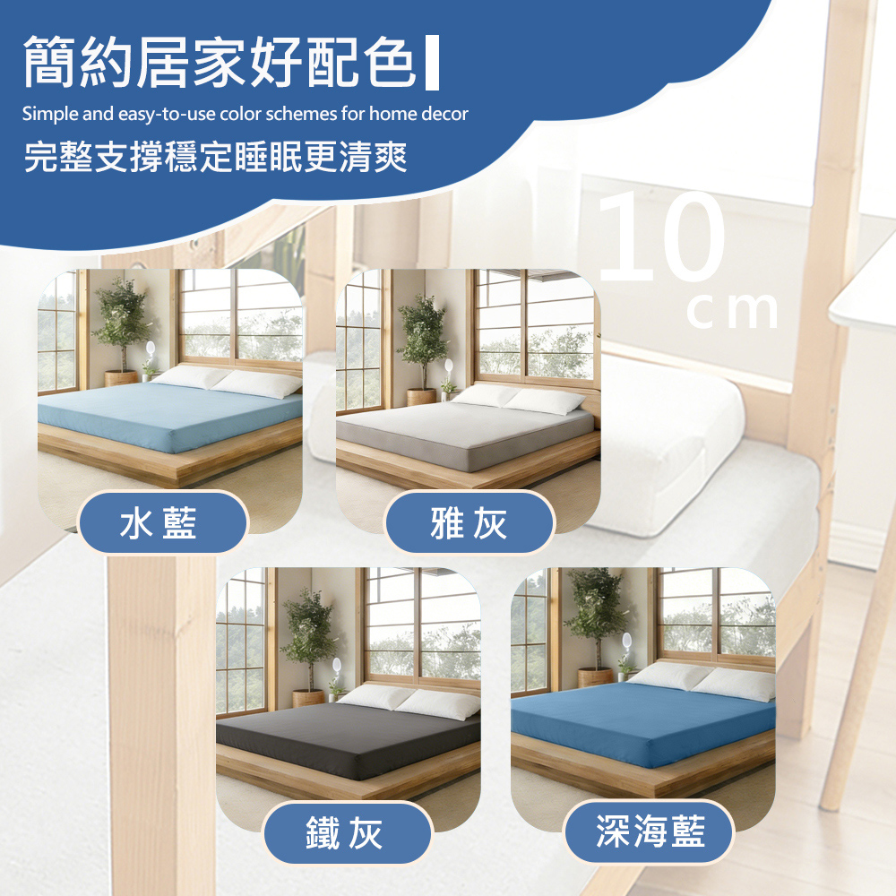 內容/規格:10CM單人加大-3.5x6.2尺(107x188±2cm)表布:100% Polyester (3M防潑水技術舒柔布)填充物:100%聚酯纖維 (高密度記憶泡棉)(含竹碳纖維)床墊套洗滌方式:可水洗/不可烘乾/不可漂白/懸掛晾乾/不可熨燙原產地:台灣精製