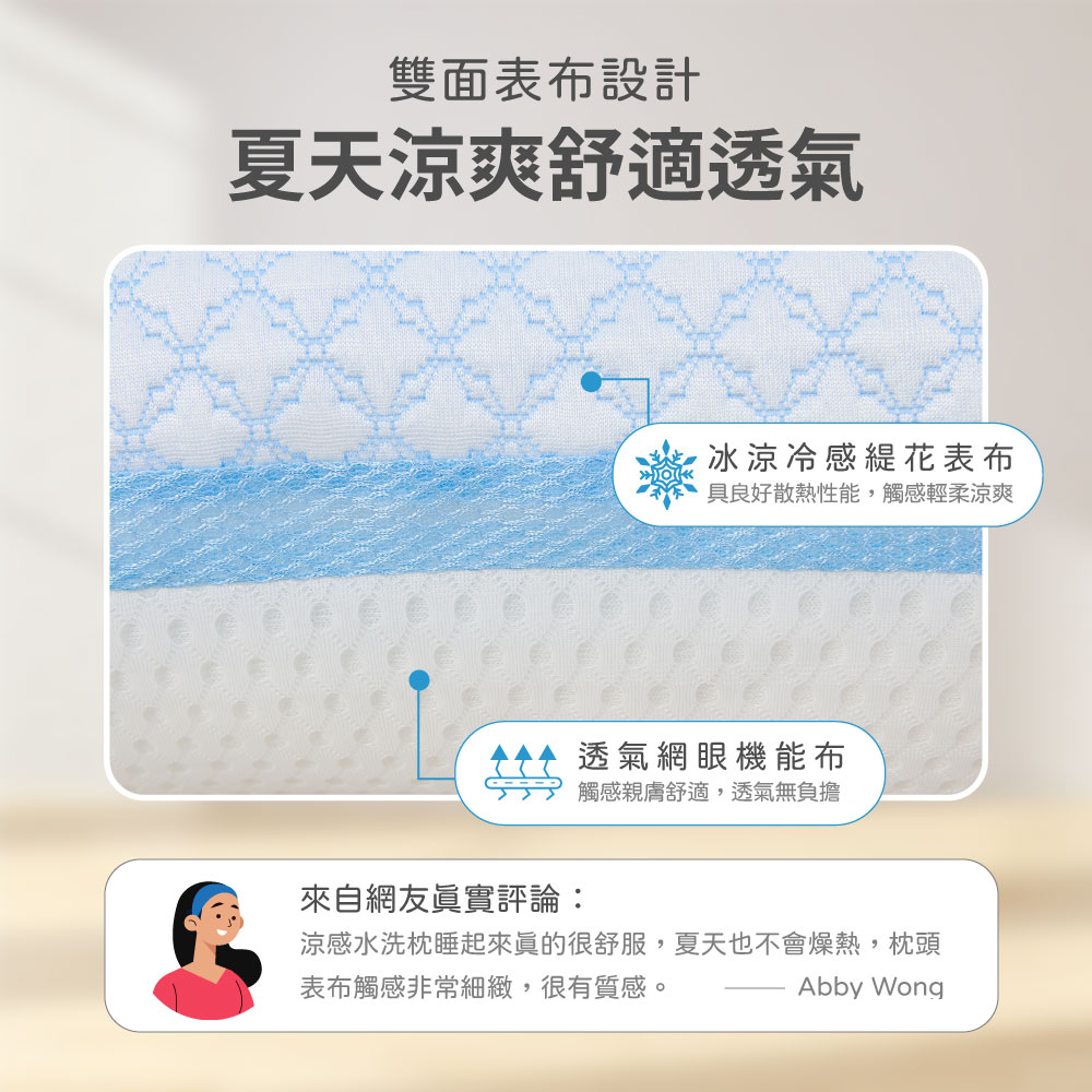 高透氣設計避免細菌殘留滋生、A級棉Q彈支撐性好 輕鬆水洗不變形、舒適涼感布設計 帶給你不一樣的睡眠體驗