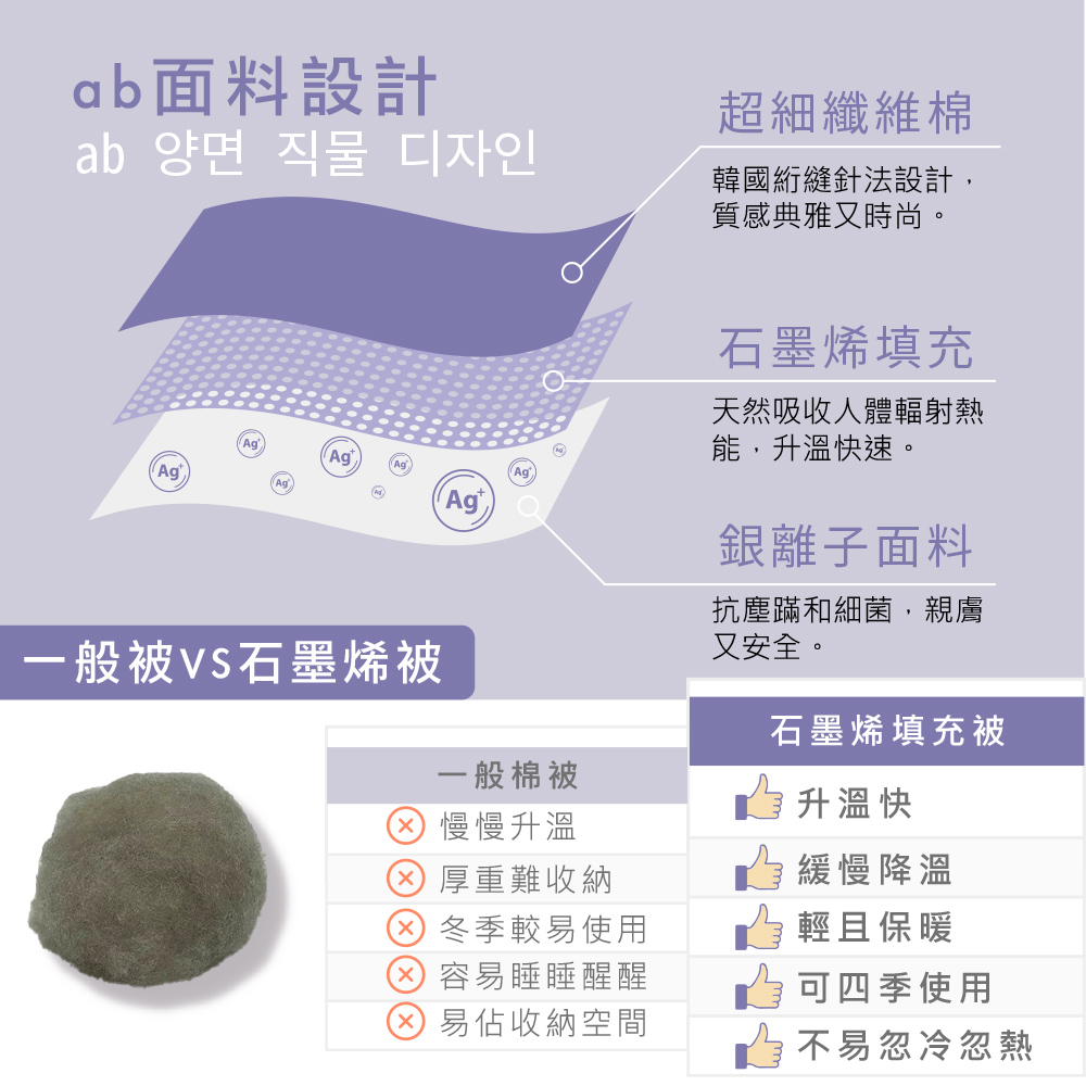 快速傳導釋熱,舒爽透氣【產品規格】大小:雙人材質:石墨稀、聚酯纖維尺寸:180x210±5%重量:1.9kg±5%產地:中國製造(台灣監製)表布材質:上層:100%聚酯纖維下層:100%聚酯纖維(含銀離子)填充物:100%聚酯纖維(內含石墨烯)