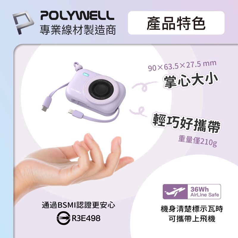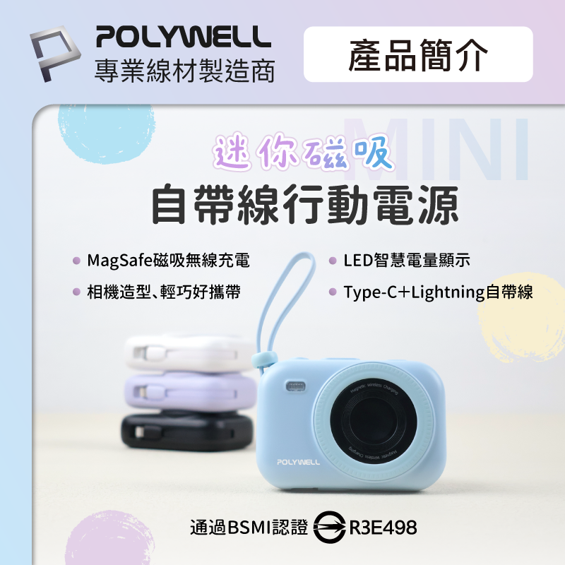 【POLYWELL】迷你磁吸自帶線行動電源 10000mAh 手機耳機手錶無線充 自帶線 USB-C/黑色/白色/藍色/紫色