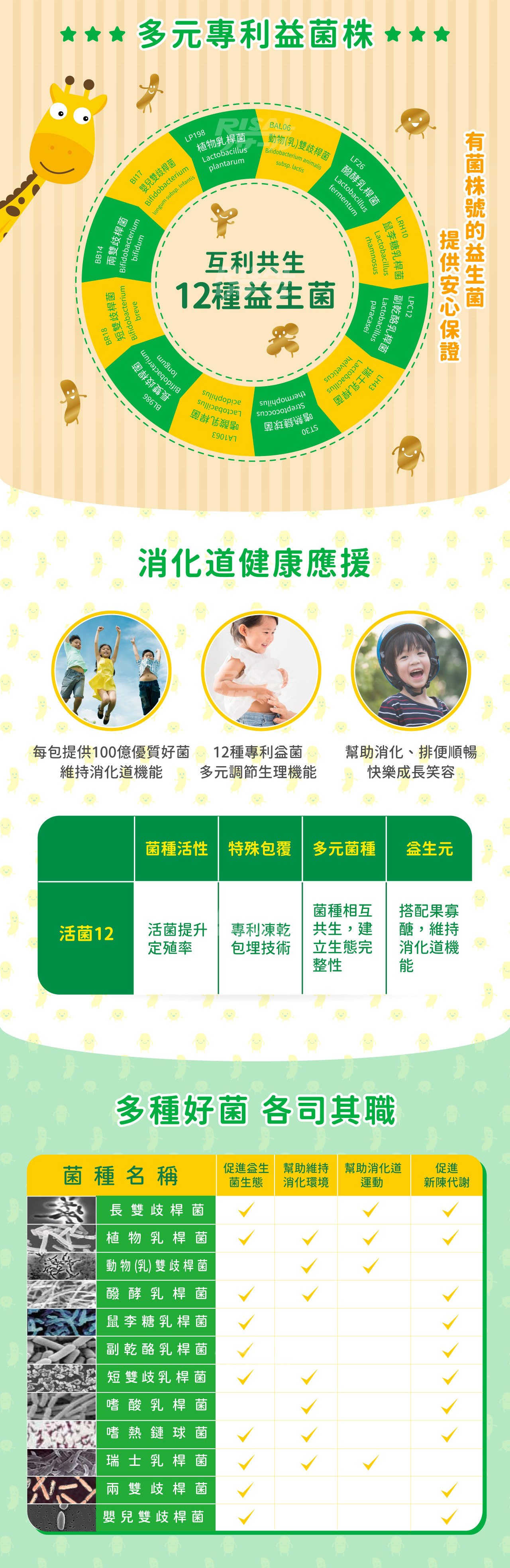 全成分:果寡醣粉(非基改玉米澱粉、果寡醣)、海藻糖、微結晶狀 α- 纖維素、乳酸菌( 植物乳桿菌 (Lactobacillus plantarum LP198) 、 動物(乳)雙歧桿菌 (Bifidobacterium animalis subsp. lactis BAL06)、 醱酵乳 桿菌 (Lactobacillus fermentum LF26) 、鼠李糖乳桿菌 (Lactobacillus rhamnosus LRH10) 、 副干酪乳桿菌 (Lactobacillus paracasei LPC12) 、 嬰兒雙歧桿菌 Bifidobacterium longum subsp. Infantis BI17) 、 長雙歧 桿菌 Bifidobacterium longum BL986) 、 短雙歧乳桿菌 Bifidobacterium breve BR18) 、 嗜酸乳桿菌 (Lactobacillus acidophilus LA1063 、 兩歧雙歧桿菌 Bifidobacterium bifidum BB14) 、 嗜熱鏈球菌 (Streptococcus thermophilus ST30) 、瑞士乳桿菌 (Lactobacillus helveticus LH43)、 香料、 檸檬酸 。