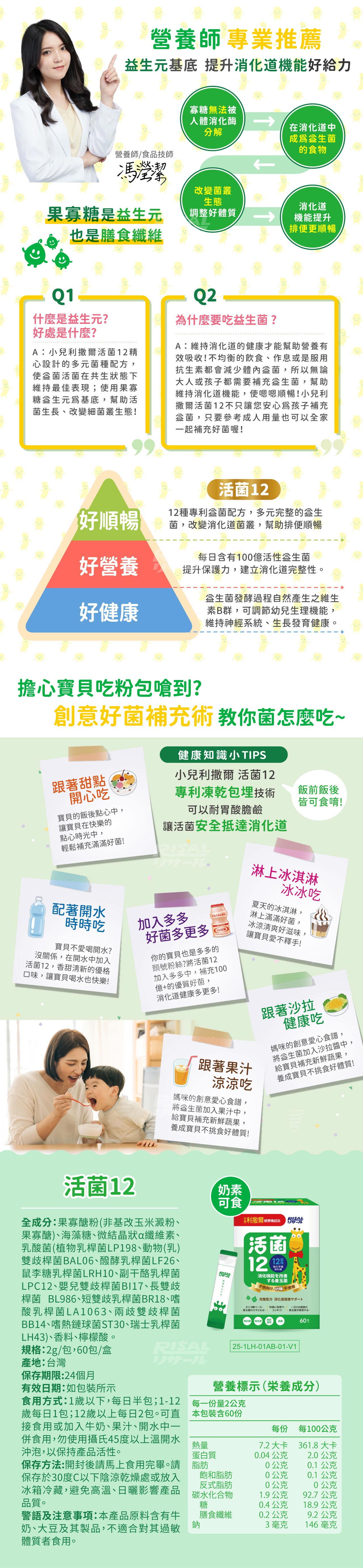 ●添加12種菌株益菌配方,多元完整的益生菌,改變消化道菌叢,幫助排便順暢。●以益生元為基底的無砂糖高纖配方,維持消化道機能,減少精製糖添加,少負擔、多健康。●選用專利包埋技術菌種配方(專利號:M603759),通過胃酸膽鹼試驗,幫助益菌安全抵達腸道,維持消化道健康。●使用獨特乳酸菌共生發酵技術,保留豐富的發酵微量產物,補充微量營養素。○無砂糖 ○無色素 ○無防腐劑 ○高纖