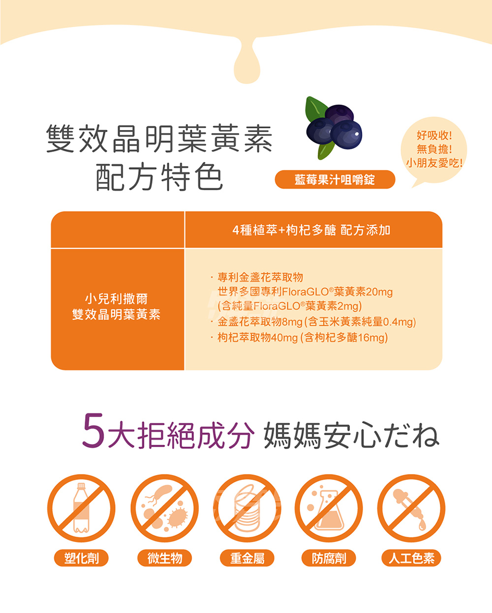 ● 專為學齡兒童設計,添加游離型葉黃素、玉米黃素、是經常閱讀、打電腦、看電視兒童的營養補充品。● 葉黃素是存在於蔬菜水果的一種類胡蘿蔔素,人體無法自行合成,必須由食物或營養補充品中攝取。● 特別配合花青素含量高的山桑子、黑豆萃取物、富含枸杞多醣的枸杞萃取物,維持機能健康,元氣滿分。● 有小朋友喜歡的藍莓果汁口味,不添加人工防腐劑,健康好吃無負擔。*山桑子萃取物本身為天然紫褐色,食用後舌頭略成紫褐色屬正常現象,請不用擔心。*本產品添加之保健成份會因時間遞減。*開封後請於1-2個月內食用完畢。請保存於30度C以下陰涼乾燥處或放入冰箱冷藏,避免高溫、日曬影響產品品質。