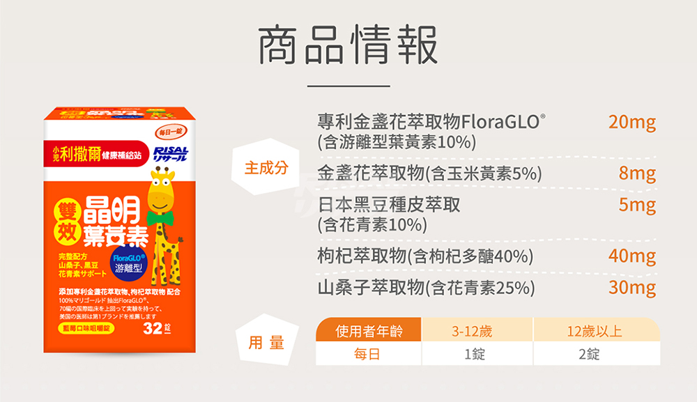 營養標示 每一份量1錠 本包裝含32份 每份 每日參考值百分比 熱量 3.6大卡 0% 蛋白質 0公克 0% 脂肪 0公克 0% 飽和脂肪 0公克 0% 反式脂肪 0公克 * 碳水化合物 0.9公克 0% 糖 0.8公克 * 鈉 0毫克 0% 葉黃素 2毫克 * 每日參考值:熱量2000大卡、蛋白質60公克、脂肪60公克飽脂肪18公克、碳水化合物300公克、鈉2000毫克 *參考值未訂定*本產品添加之保健成份會隨時間遞減 其它成份 每份 添加枸杞萃物 40毫克 含枸杞多醣40% 添加山桑子萃取物(ビルベリー) 30毫克 含花青素25%(アントシアニン) 添加金盞花萃取物(マリーゴールド抽出物) 8毫克 含玉米黃素5%(ゼアキサンチン) 添加黑豆萃取物(黒豆抽出物) 5毫克 含花青素10%(アントシアニン) 一日請勿超過5錠、多食無益 本產品添加之保健成份會隨時間遞減