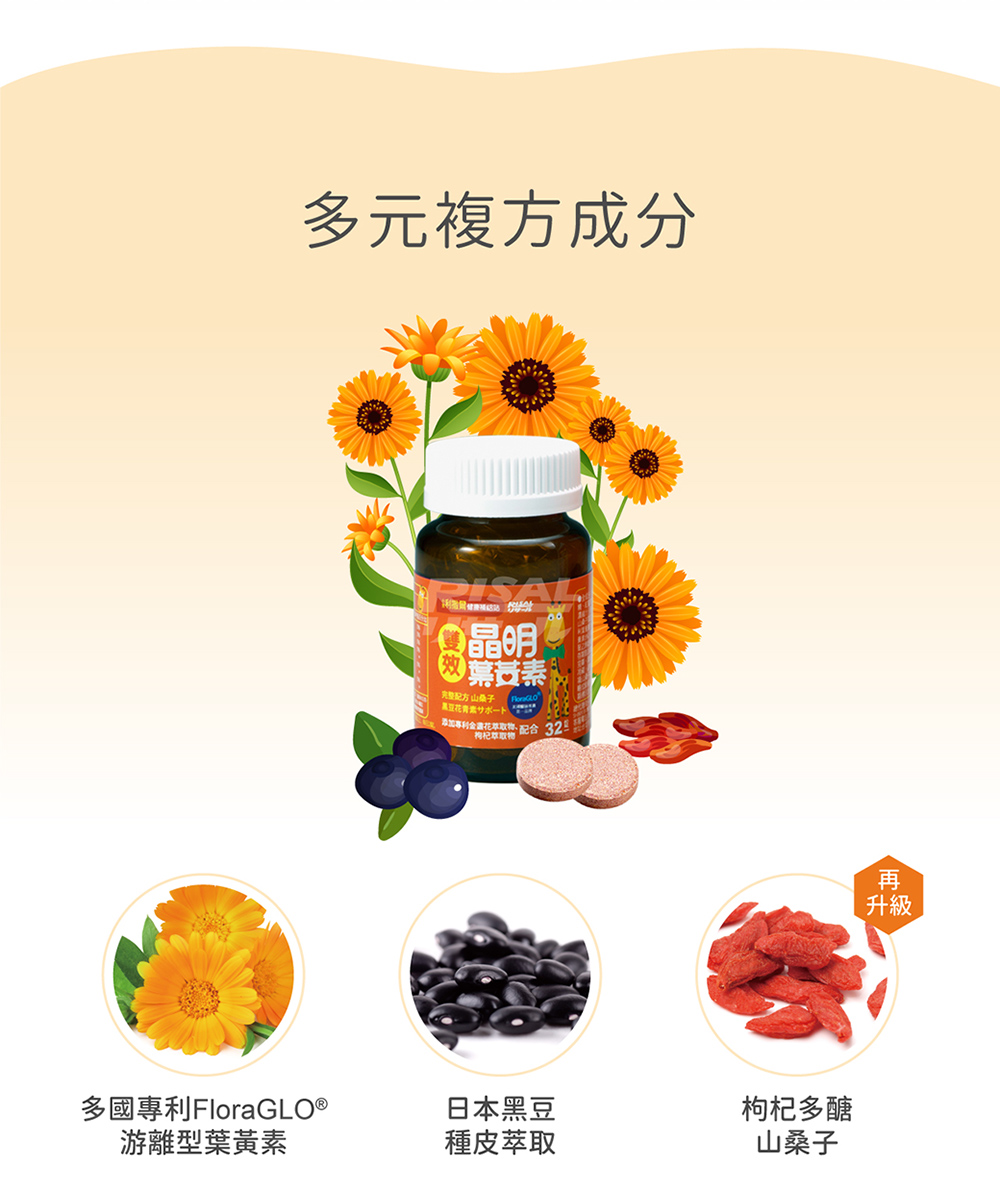 ●全成分:葡萄糖、乳糖、紅葡萄果汁粉(麥芽糊精、紅葡萄濃縮汁、阿拉伯膠)、藍莓果汁粉(藍莓濃縮汁、麥芽糊精)、枸杞萃取物(枸杞多醣40%)(枸杞萃取物、麥芽糊精)、山桑子萃取物(含花青素25%)、FloraGLO® 葉黃素10%(葉黃素、辛烯基丁二酸鈉澱粉、乾燥葡萄糖漿、蔗糖、L-抗壞血酸鈉(抗氧化劑))、硬脂酸鎂、金盞花萃取物(玉米黃素5%)(金盞花、麥芽糊精)、檸檬酸、黑大豆種皮萃取物(含10%花青素)、聚乙烯吡咯烷酮●內容量:32錠/盒●產地:台灣●保存期限:2年●保存方法:開封後請於1-2個月內食用完畢。請保存於30度c以下陰涼乾燥處或放入冰箱冷藏,避免高溫、日曬影響產品品質。●注意事項:山桑子萃取物本身為天然紫楬色,食用後舌頭略成紫褐色屬正常現象,請不用擔心●本產品含有牛奶、大豆及其製品,對其過敏者注意。