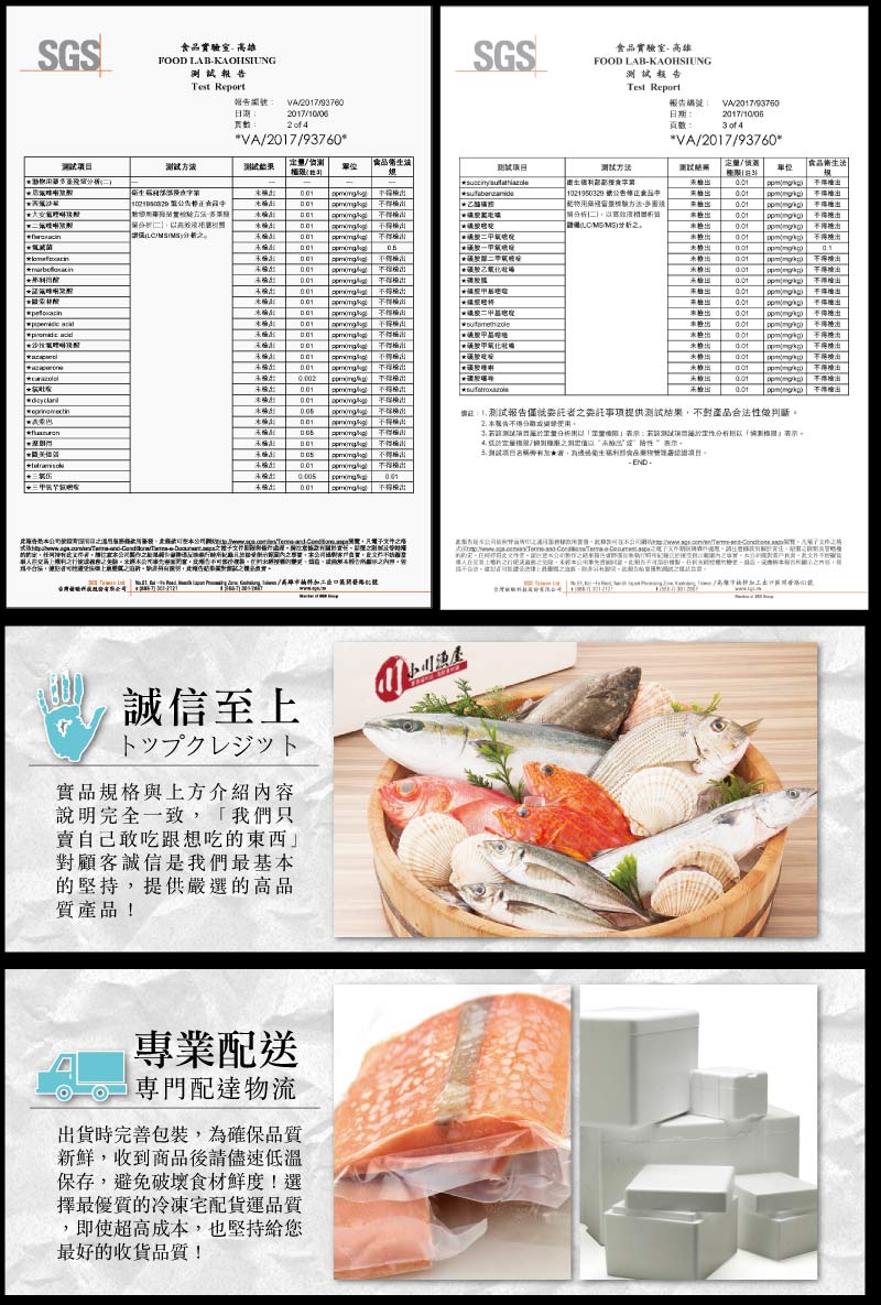保存方式 冷凍-18℃以下食用方式 各式料理內容物成份 鱸魚熱量 可免標示每份營養成份 可免標示內容量 ( g/ml ) 100~200g/片食品添加物名稱 無產地(國家或台灣縣市) 台灣廠商名稱 豪鮮食品廠商電話號碼 07-3650350廠商地址 高雄市大社區旗楠路88號保存期限 如包裝所示投保產品責任險字號 150310PD03743食品業者登錄字號 E-154625729-00000-2