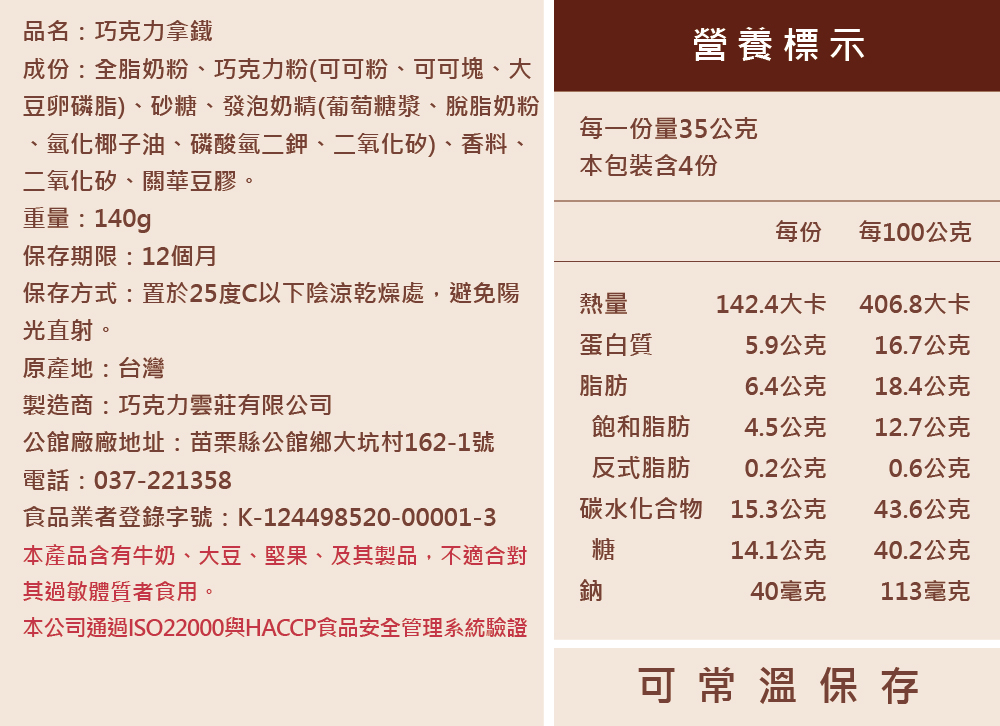 全脂奶粉、巧克力粉(可可粉、可可膏、大豆卵磷脂)、砂糖、發泡奶精(葡萄糖漿、脫脂奶粉、氫化椰子油、磷酸氫二鉀、二氧化矽)、香料、二氧化矽、關華豆膠