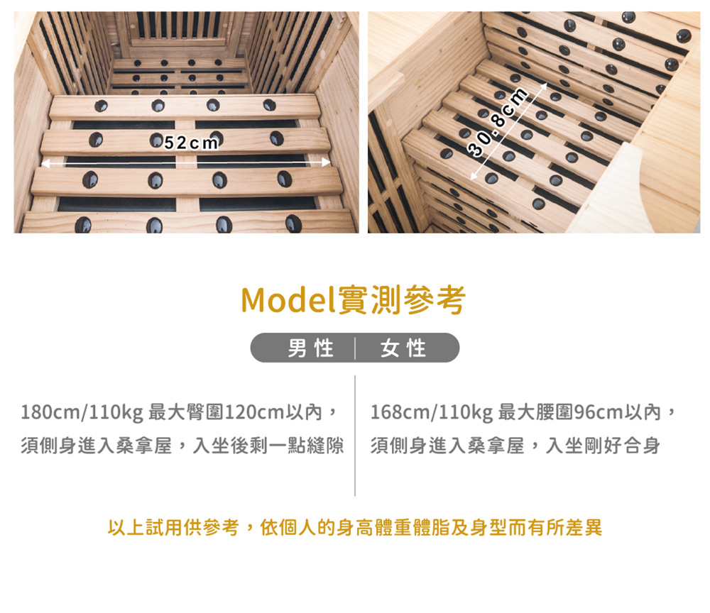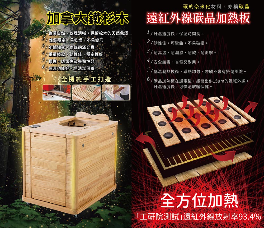 반신욕 사우나★獨家專利★ 頂 級 御 用 款■全身/半身,兩用式 原木桑拿屋■免組裝,附煞車底輪,好移動,隨開即用■嚴選加拿大鐵杉木100%手工打造■數位控制面板,可定溫定時■智慧恆溫系統,18-65度可調整■7片遠紅外線碳晶加熱板,加熱速度快■5個金屬散熱孔,過熱自動斷電系統■112顆養生黑碧璽,釋放微弱電流及溫熱能量■工研院遠紅外線測試,放射率達93.4%■5000萬產品責任險■附贈:高級毛毯、桑拿服、藥草包x2、藥草麻袋、說明書、保證卡◎貼心提醒◎ 本產品尺寸較大(寬62x深83x高82cm),請先量妥家中擺放位置的長寬高後,再購買。本產品屬於親膚接觸的衛生品關係(注意!網購猶豫期非試用期)辦理退貨商品必須是"全新未拆封膜狀態"且"包裝完整",否則將會影響退貨權限。