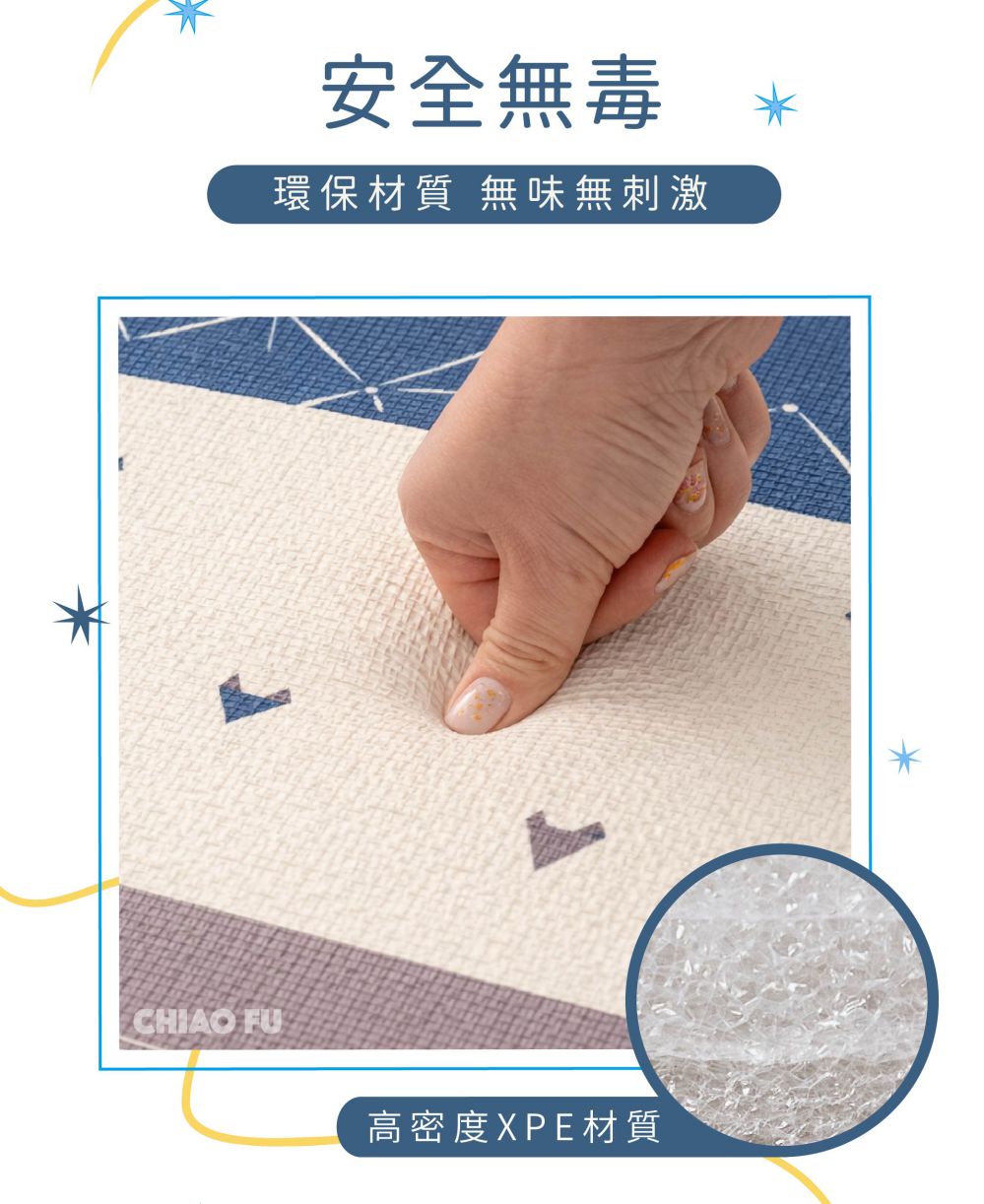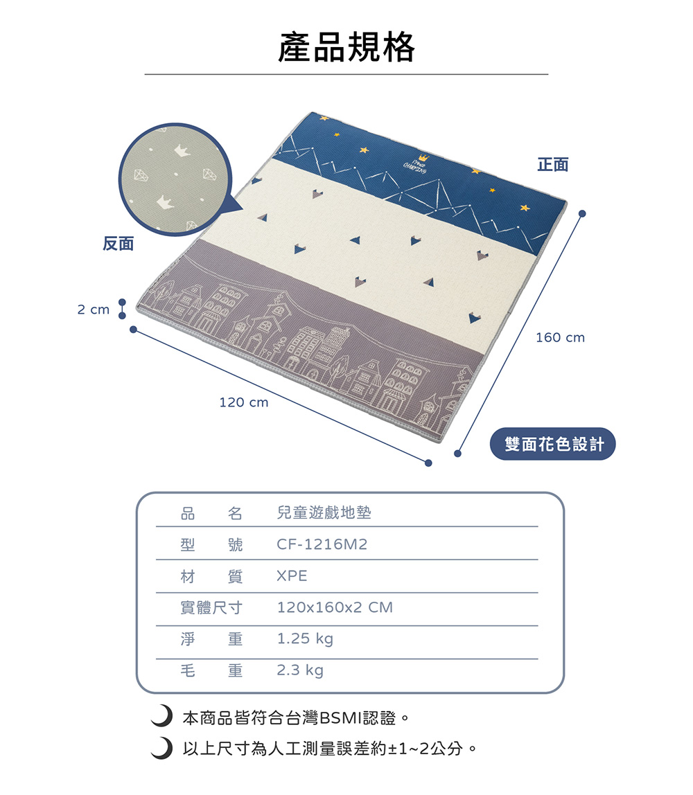 ■雙面圖案,兩面可輪流使用■繽紛色彩,刺激寶寶視覺及認知■高密度XPE材質,防水抗汙,安全無毒■一體成形,回彈性佳,減震降噪■防滑紋路,呵護寶報的每一步■一捲一鋪,輕巧方便好收納■可完美搭配巧福兒童圍欄CF-1216使用■產品尺寸:120x160x2 cm■0歲即可使用,無年齡限制■台灣ST玩具認證檢驗合格■經濟部標準檢驗局檢驗合格 R51286