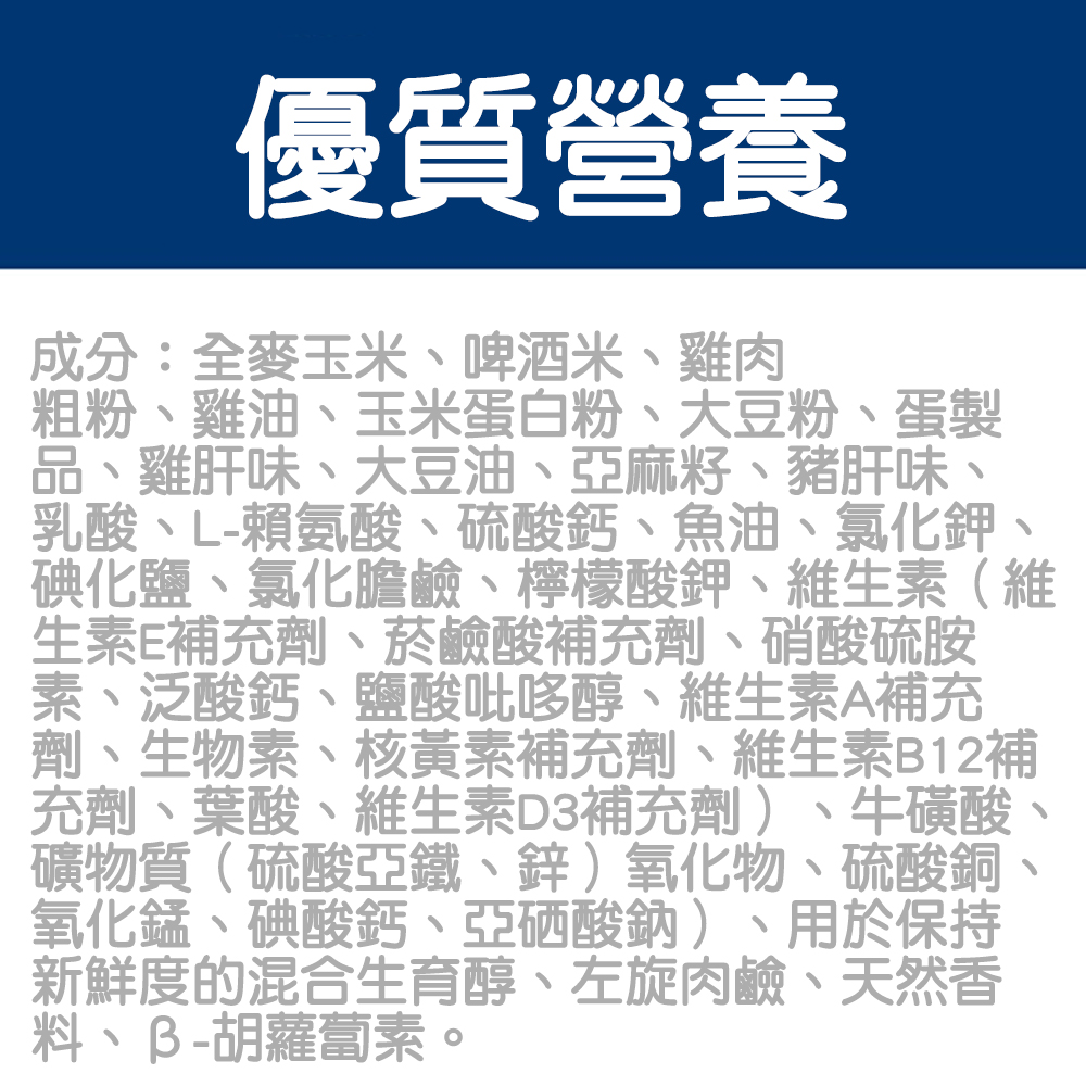 全穀粒玉米、雞肉粉、豬肉脂肪、玉米筋質粉、黃豆粕、蛋製品、黃豆粉、雞肝香料、麥麩、黃豆油、乳酸、亞麻仁籽、豬肝香料、左旋離胺酸、硫酸鈣、魚油、氯化鉀、碘鹽、氯化膽鹼、檸檬酸鉀、維生素(維生素E添加劑、菸鹼酸添加劑、維生素B1、維生素B6、泛酸鈣、核黃素添加劑、生物素、維生素B12添加劑、維生素A添加劑、葉酸、維生素D3添加劑)、牛磺酸、礦物質(硫酸亞鐵、氧化鋅、硫酸銅、氧化錳、碘酸鈣、亞硒酸鈉)、左旋肉酸素、添加綜合維生素E及檸檬酸以保鮮、天然香料、β-胡蘿蔔素。