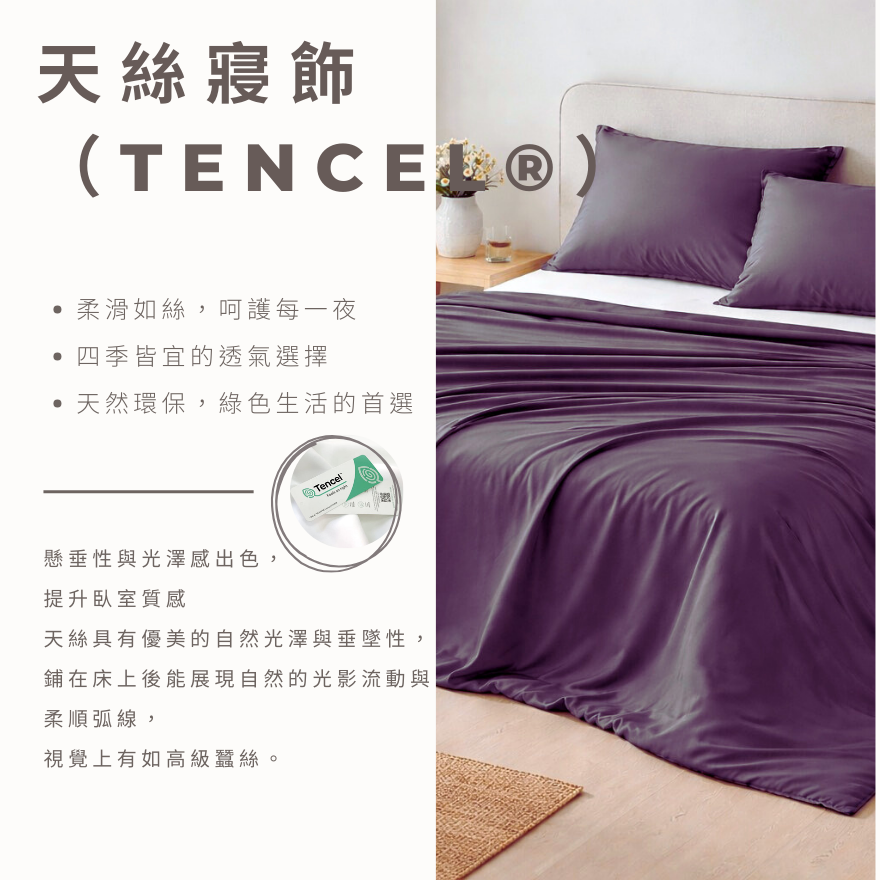 ・100%天絲™Lyocell,親膚無毒,環保永續