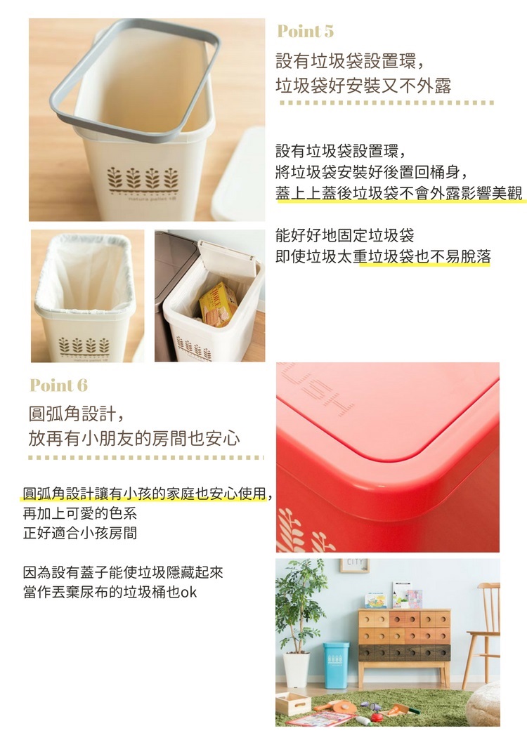 滑蓋式上蓋,只需輕壓push處滑動開啟,輕鬆又簡單內附垃圾袋設置環,蓋上上蓋垃圾袋不外露影響美觀桶身及上蓋圓弧角設計,放置在兒童房間也安心纖細的外型,能輕鬆擺放在狹窄的空間簡單三部分可以拆開,清洗更容易*購買兩個以上請選擇宅配*