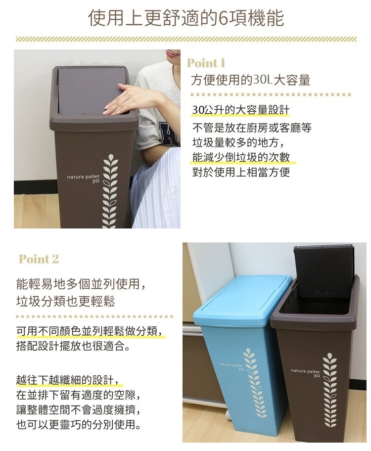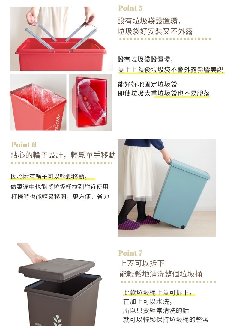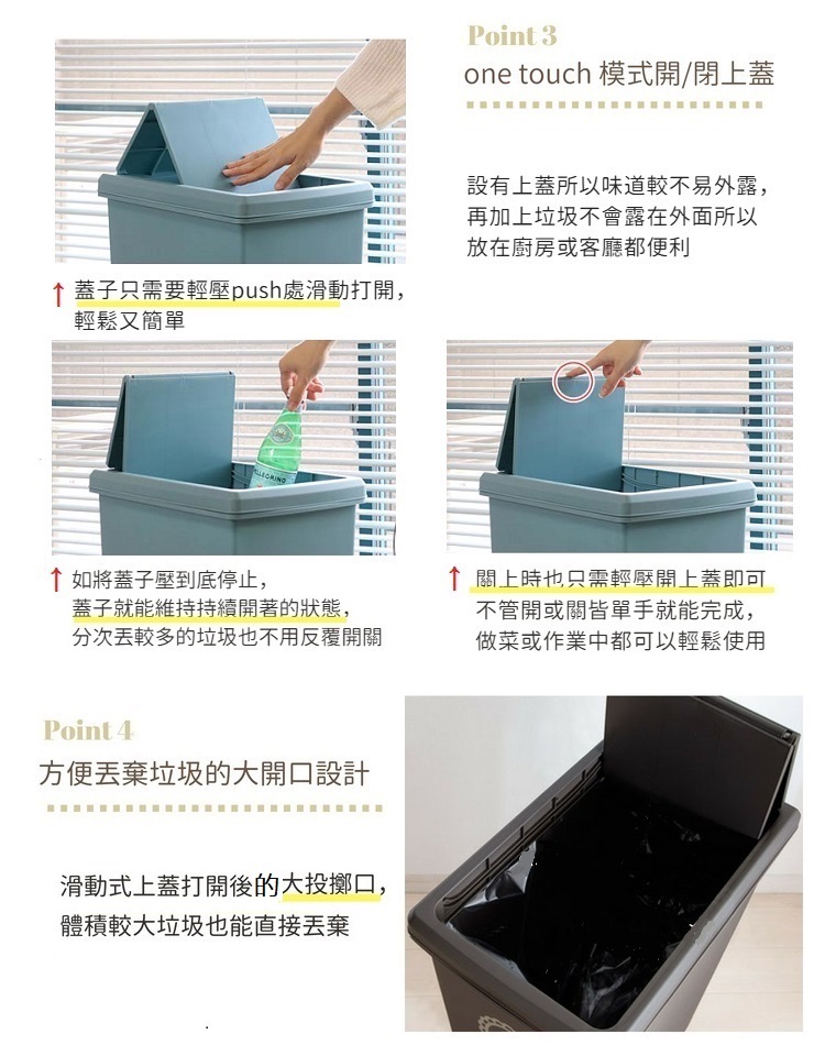 滑蓋式上蓋,只需輕壓push處滑動開啟,輕鬆又簡單內附垃圾袋設置環,蓋上上蓋垃圾袋不外露影響美觀設有輪子,單手就能輕鬆移動大開口設計,丟棄垃圾更方便桶身及上蓋能拆開,可容易地清洗
