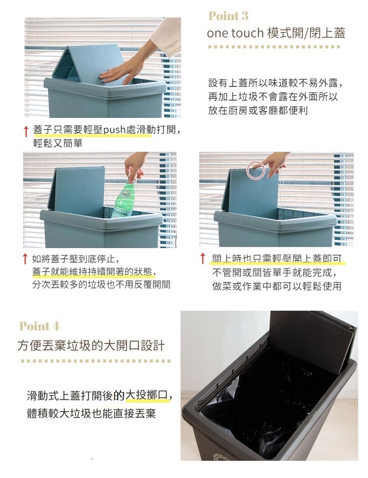 滑蓋式上蓋,只需輕壓push處滑動開啟,輕鬆又簡單內附垃圾袋設置環,蓋上上蓋垃圾袋不外露影響美觀設有輪子,單手就能輕鬆移動大開口設計,丟棄垃圾更方便桶身及上蓋能拆開,可容易地清洗本體尺寸:約21×34×45.5cm材質:PP原產地:日本容量:約20L