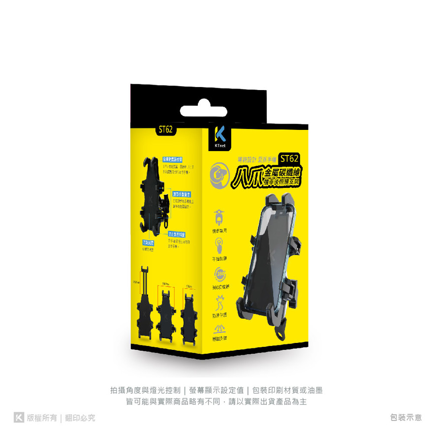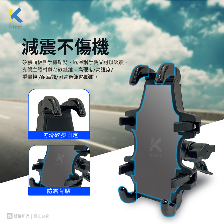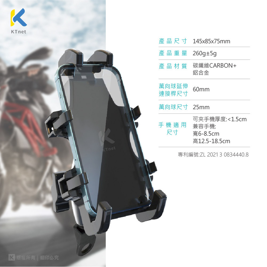 特色:■八爪牙棒固定手機,崁住、固定、托住手機各司其職。■單手快速取放手機,防震、防掉、防刮。■雙材質優化結合,既有緩衝效果也有牢固抓扣的效果。■機車後照鏡的轉接桿結合,金屬+金屬的固定為最佳無縫接軌。■延伸轉接頭的轉接, 與台灣機車的相容性達到最高。■矽膠面板與手機貼背,既保護手機又可以吸震■支架主體材質為碳纖維,高硬度/高強度/重量輕 /耐腐蝕/耐高低溫熱膨脹。■雙合金腳座及延伸連接桿,對應後照鏡孔位,不變型耐耗損。■超大萬向球結構,鎖定後固定不晃動,多元隨意橫豎翻轉角度。■後照鏡孔位尺寸腳座適用99%機車/電動車。商品規格:產品尺寸 :145x85x75mm產品重量 :260g±5g產地 : 中國材質 : 碳纖維CARBON+鋁合金包裝尺寸 : 97x85x158mm包裝內容 :手機支架x1、連接桿x1、後照鏡腳座x1、後照鏡增高螺絲x16角板手x1、6角螺絲x4、6角螺絲母x4、左右邊爪x4、PVC護套x4本產品一年保固:新品七天換貨 / 保修一年※請注意!產品因非人為故障必須更換新品需知(1)購買七日內發生故障,可憑發票及購買憑證就原購買地換新(2)外觀請維持良好無刮傷與無髒污(3)包裝完整及商品配件齊全注意事項1.該產品非玩具,請置於孩童不易取得之處,以免發生危險。2.請勿置於腐蝕或高溫環境中。3.購買前請先確認尺寸是否適用您的電子設備。4.行進間請勿調整手機,避免危險駕駛。5.本商品保固條款不針對該商品以外的應用設備做保固。6.當該商品使用在交通工具時。因使用者個人駕車習慣導致該商品及設備損壞時,當認定為人為損壞,非保固範圍內。注意事項1.該產品非玩具,請置於孩童不易取得之處,以免發生危險。2.請勿置於腐蝕或高溫環境中。3.購買前請先確認尺寸是否適用您的電子設備。4.行進間請勿調整手機,避免危險駕駛。5.本商品保固條款不針對該商品以外的應用設備做保固。6.當該商品使用在交通工具時。因使用者個人駕車習慣導致該商品及設備損壞時,當認定為人為損壞,非保固範圍內。