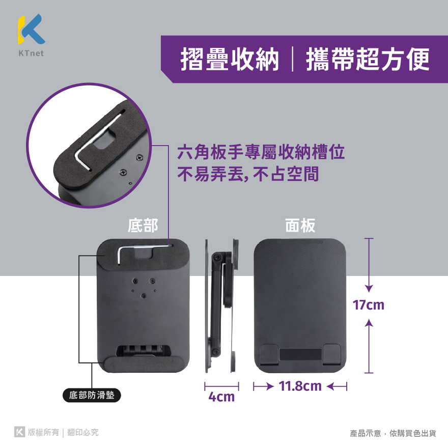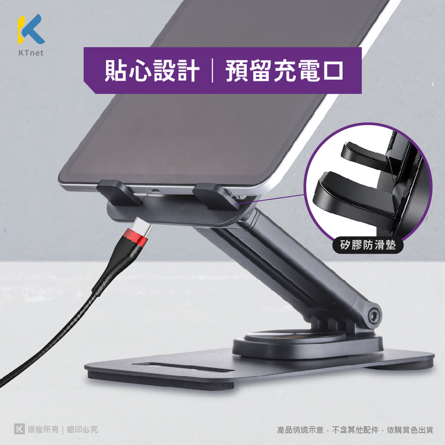 特色:1.手機及平板 4.3"~13"大小尺寸皆通用2.雙轉軸調整各式角度,升降高低,站坐高低多樣視覺角度3.360度旋轉雲台,輕鬆調整觀看角度,開會/追劇輕鬆愜意4.攜帶外出無負擔5.充電走線設計,防滑紋路面板,邊充電邊使用6.雙鋁質強力升降支桿,鐵質底板加厚防滑底材超穩重力不傾倒7.防碰撞防刮痕防滑矽膠墊片,安心使用保護設備8.應用環境:視訊上課,會議溝通,團體聚會,直播主,追劇,料理學習尺寸 : 170*118*40mm(摺疊收納)淨重 : 515g±5g含包裝重量 : 586g±5g產地 : 中國材質 : ABS塑膠+鋁合金+全金屬底座+矽膠防滑墊包裝尺寸 : 173*125*44mm包裝內容 : 支架×1+六角板手×1(置於支架底部)注意事項1.該產品非玩具,請置於孩童不易取得之處,以免發生危險。2.請勿置於腐蝕或高溫環境中。清潔方式使用半乾的擦拭布清潔與擦拭耳罩或耳罩網,濕抹布可擦拭本產品一年保固:新品七天換貨 / 保修一年※請注意!產品因非人為故障必須更換新品需知(1)購買七日內發生故障,可憑發票及購買憑證就原購買地換新(2)外觀請維持良好無刮傷與無髒污(3)包裝完整及商品配件齊全
