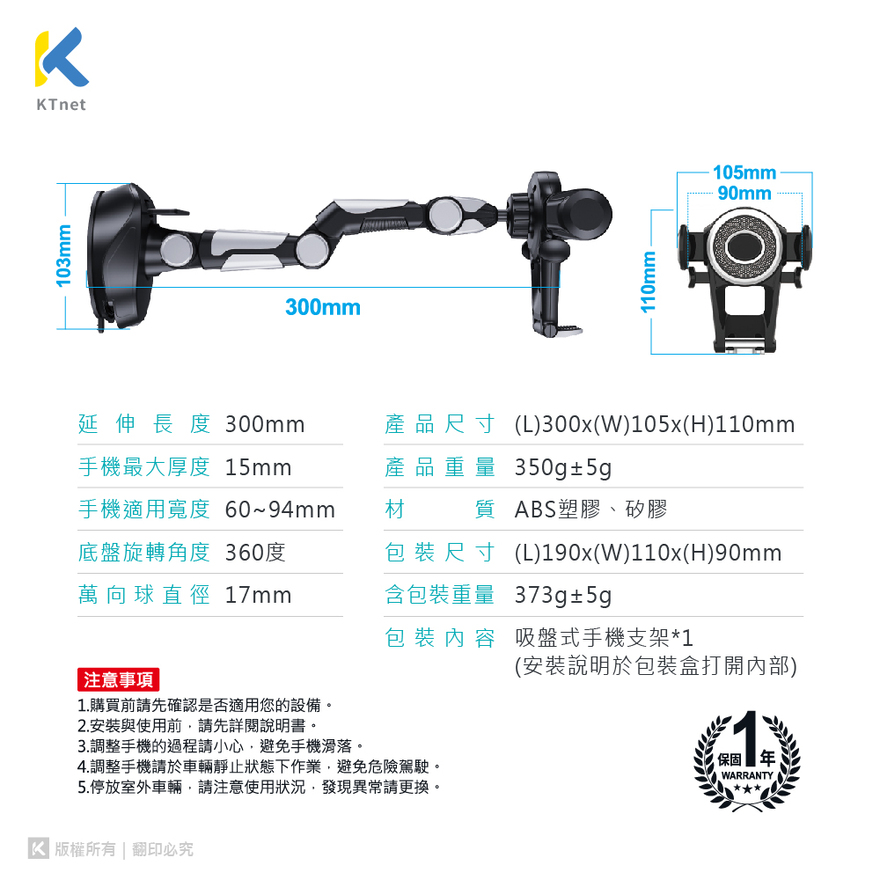 注意事項1.購買前請先確認是否適用您的設備。2.安裝與使用前,請先詳閱說明書。3.調整手機的過程請小心,避免手機滑落。4.調整手機請於車輛靜止狀態下作業,避免危險駕駛。5.停放室外輛,請注意使用狀況,發現異常請更換。