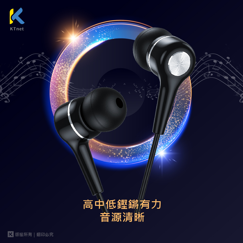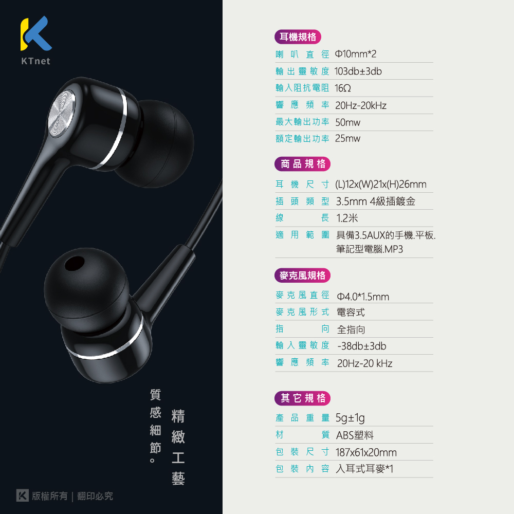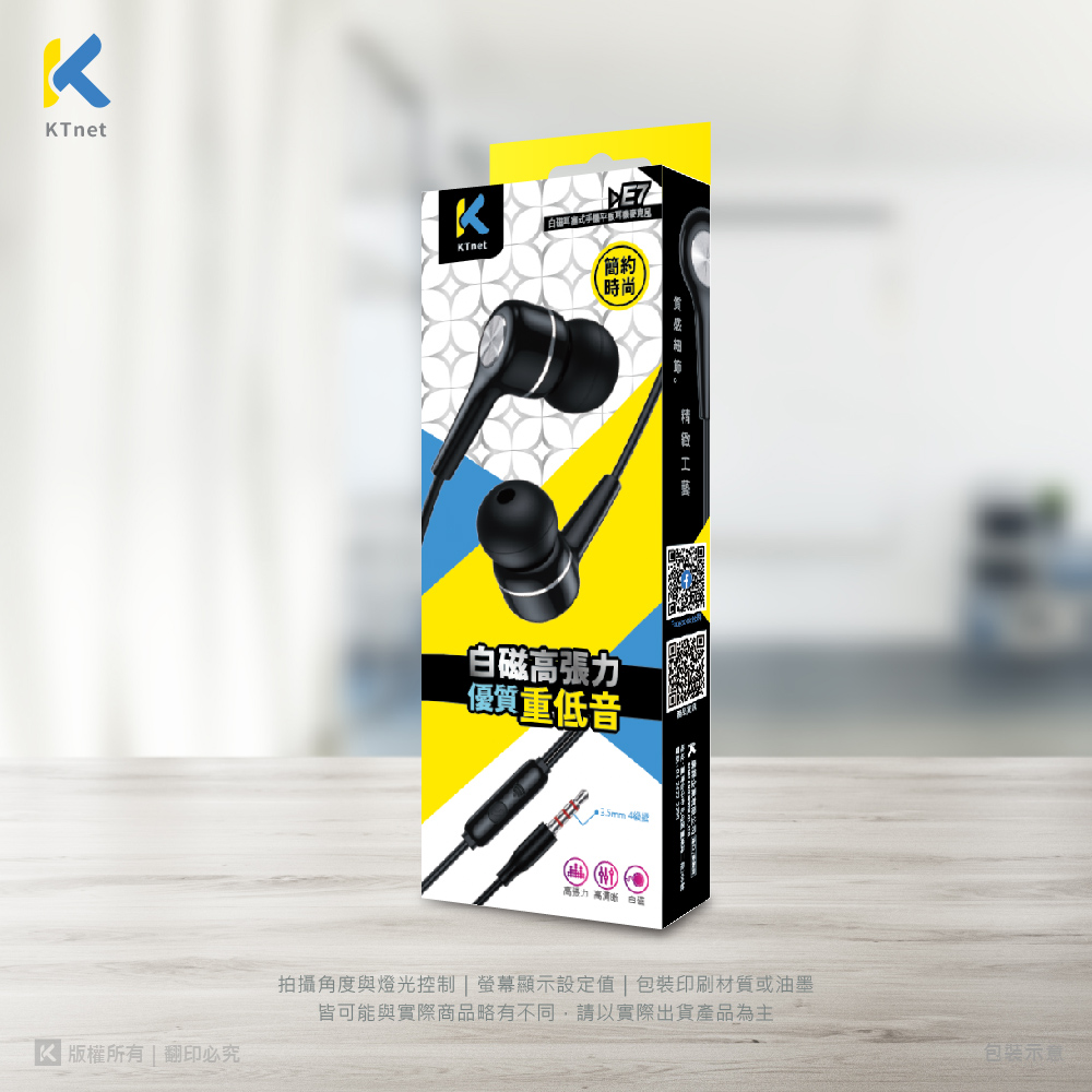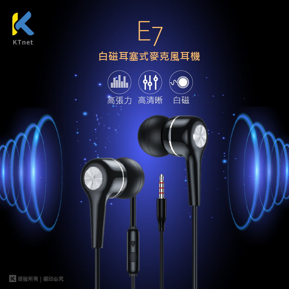 【KTNET】E7 白磁耳塞式手機平板耳機麥克風4極插 黑色