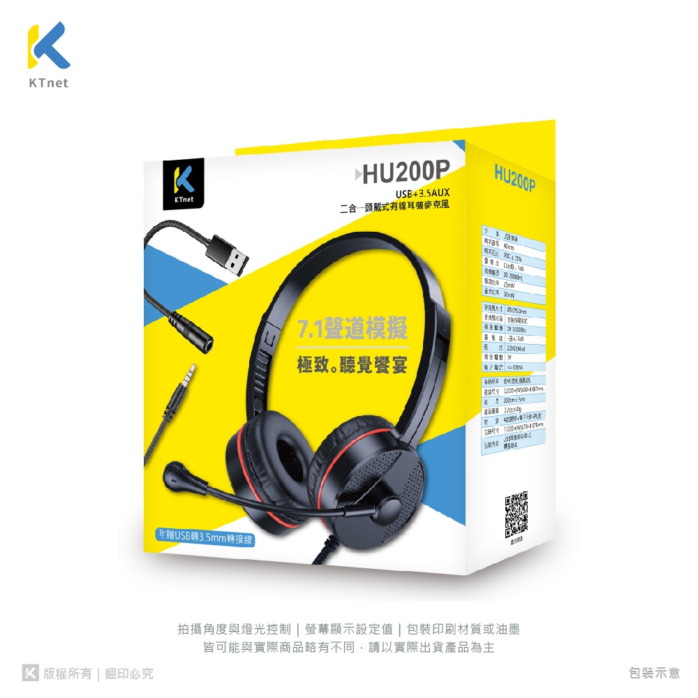 【KTNET】HU200P USB+3.5AUX 二合一頭戴式有線耳機麥克風
