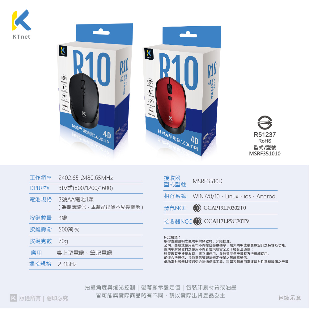 【KTNET】R10 4D無線光學滑鼠1600DPI 黑色