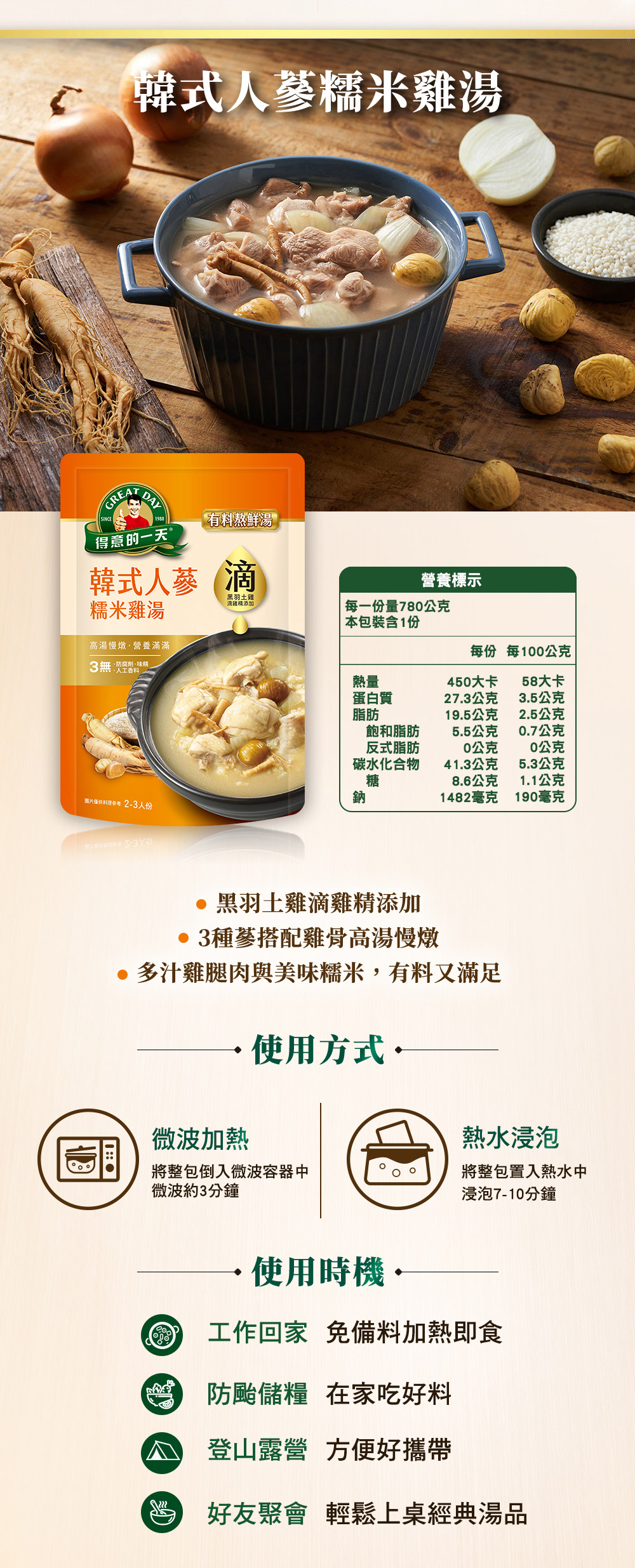 [正光藥局]得意的一天-韓式人蔘糯米雞湯780G /袋 (2~3人份)_2入組