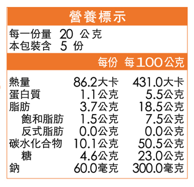 花蓮糙米、海藻糖、麥芽、糖、棕櫚油(非氫氧化植物油)、薑黃粉、海鹽