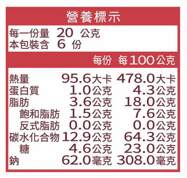 花蓮糙米、海藻糖、麥芽、棕櫚油(非氫氧化植物油)、洛神花粉、海鹽
